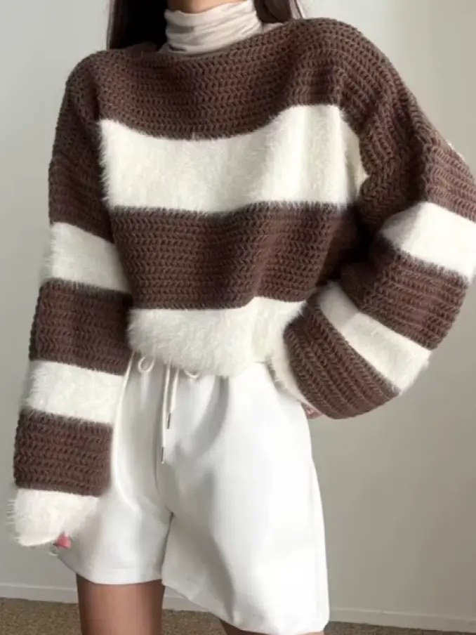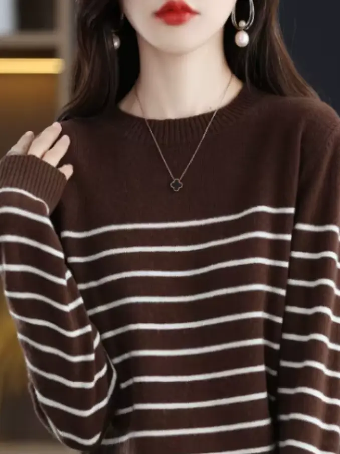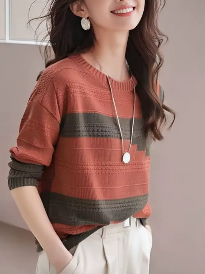 Women Knitted O Neck Striped Sweater