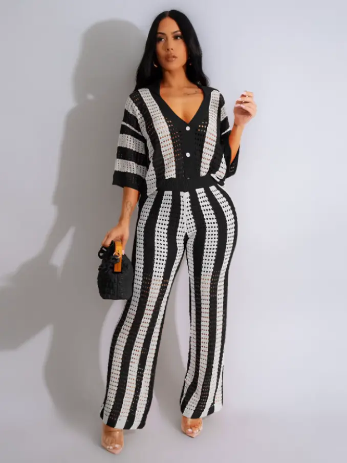 Casual Half Sleeve Cardigan Stripe Wide Leg Pant...