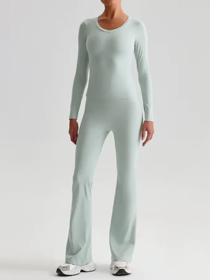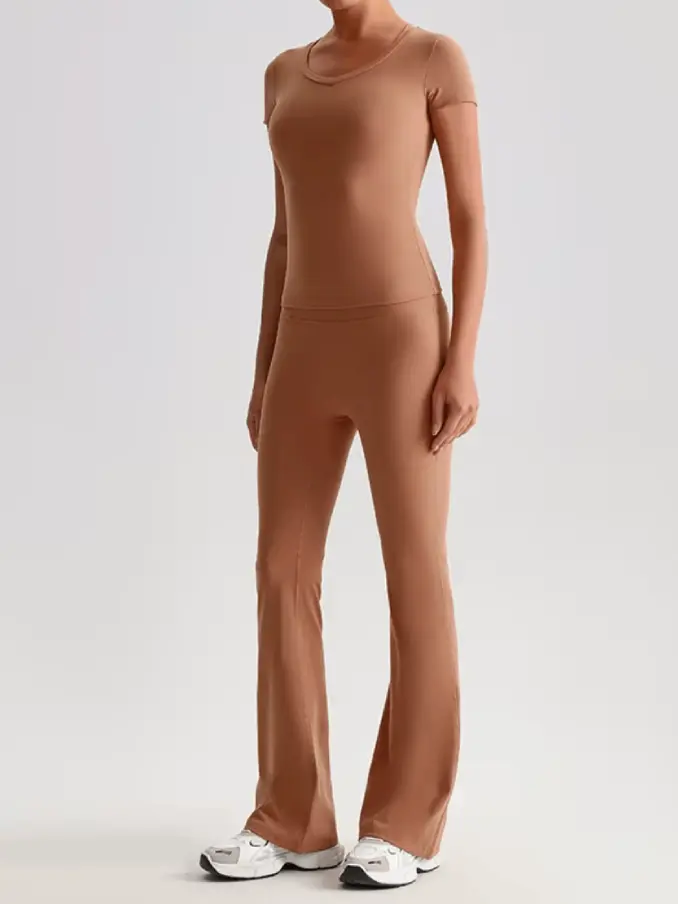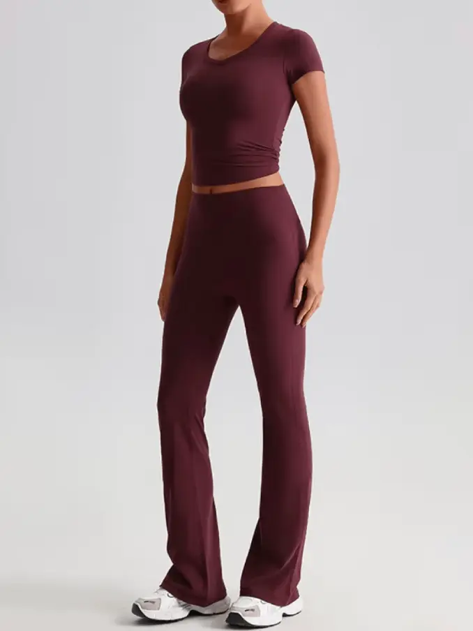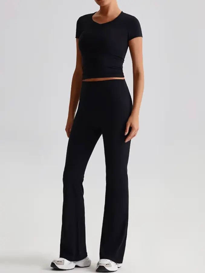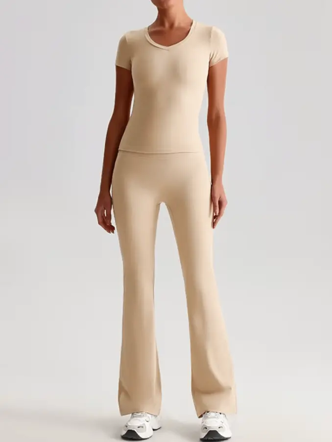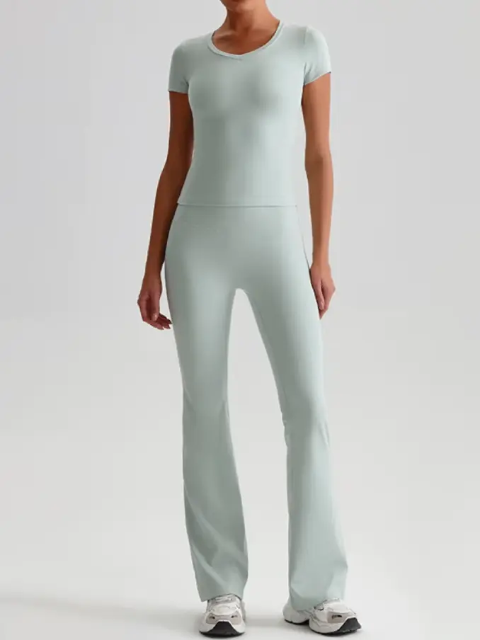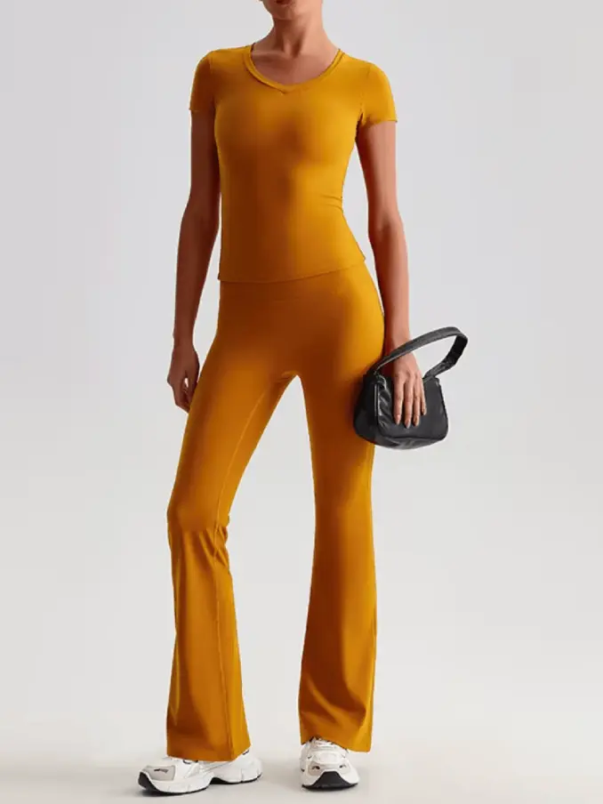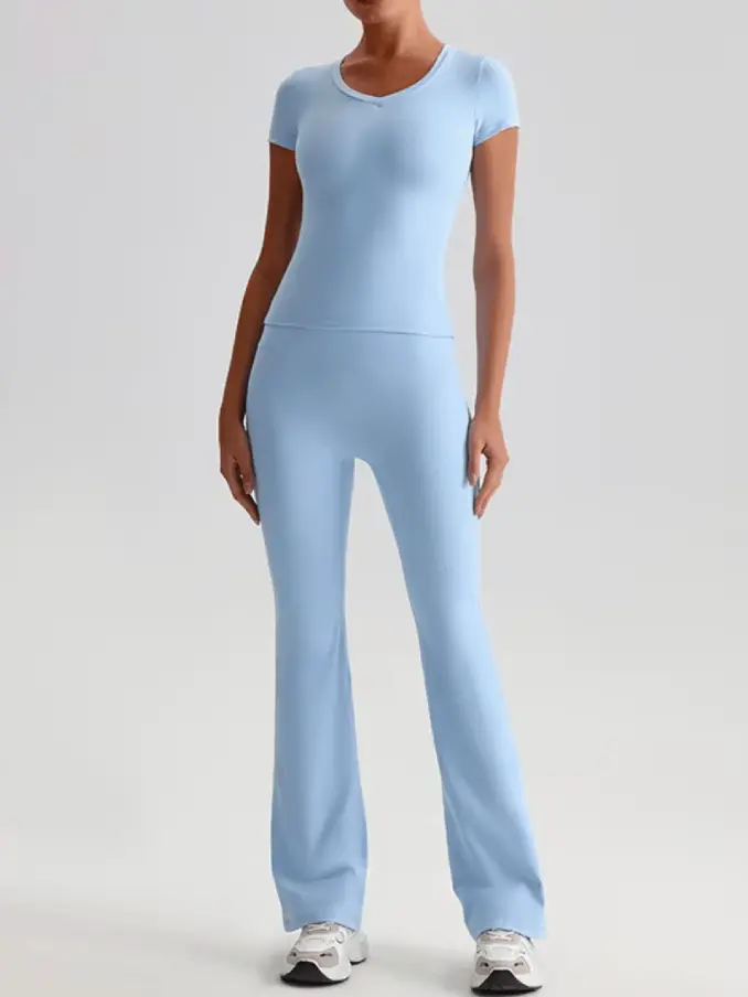 Spring Women's Casual Outfits Stretchy V Neck Workout Tshirt Top Flare Pants Leggings 2 Piece Workout Sets