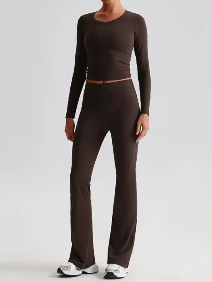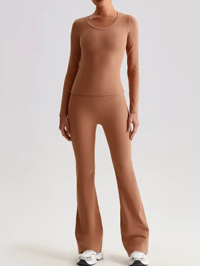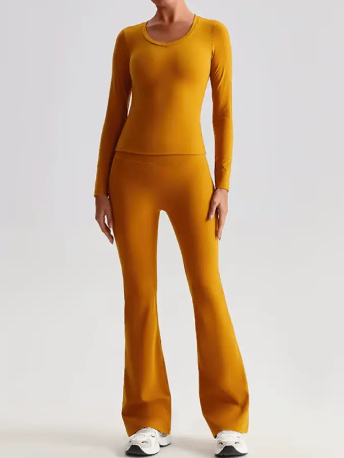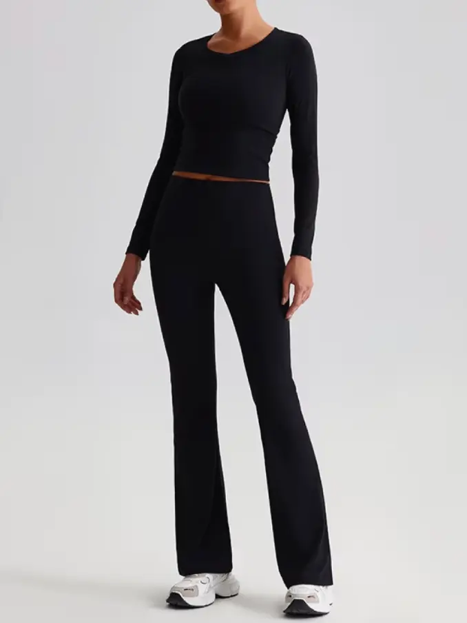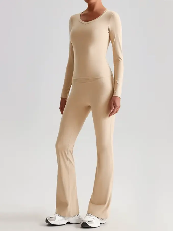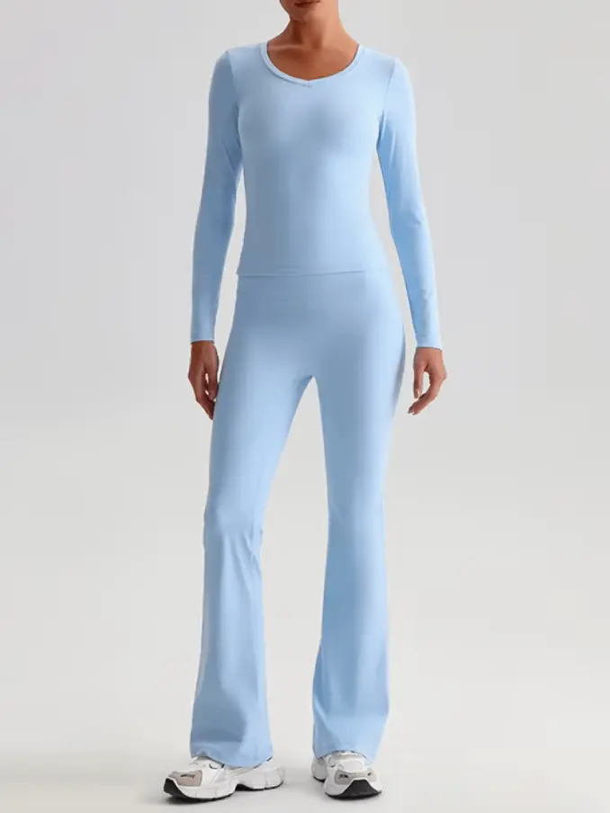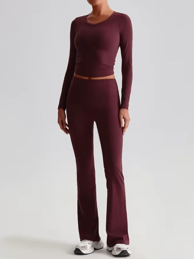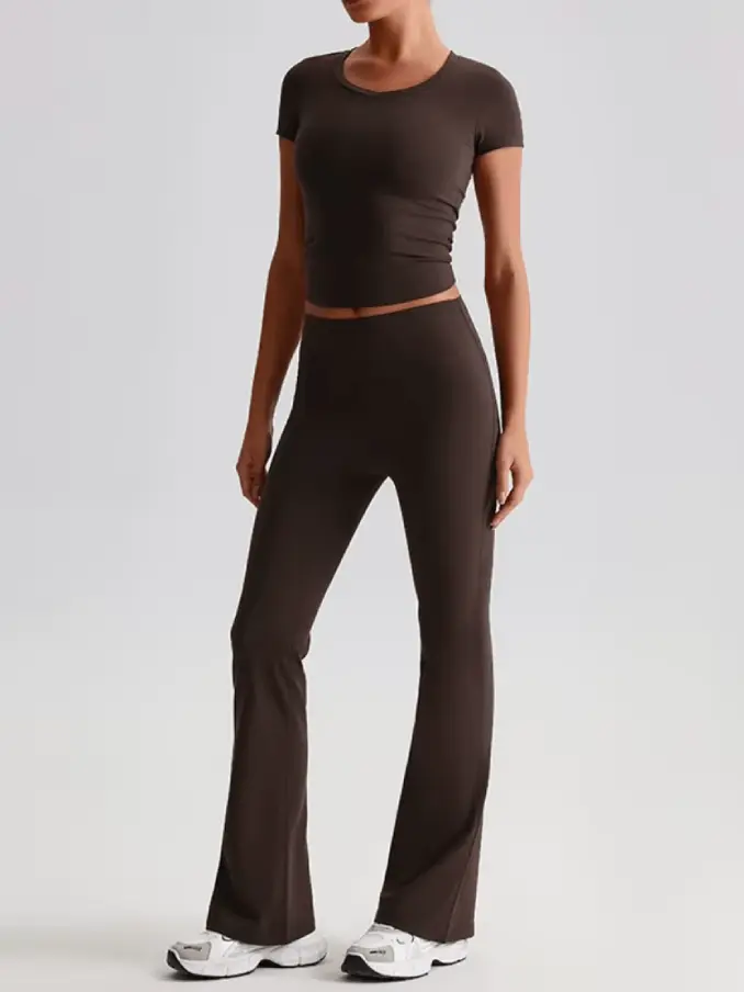 Spring Women's Casual Outfits Stretchy V Neck Workout Tshirt Top Flare Pants Leggings 2 Piece Workout Sets