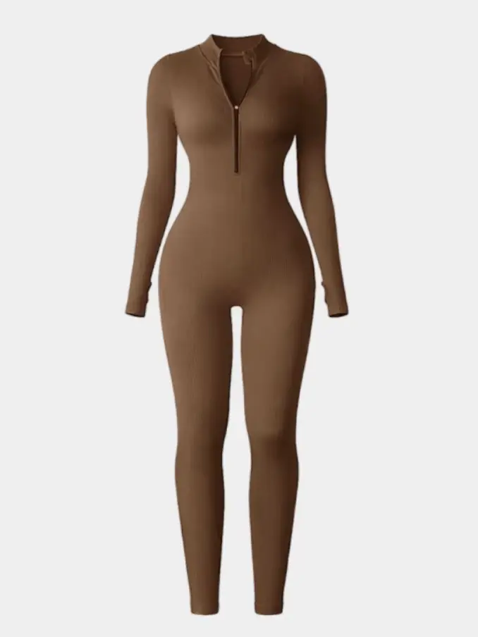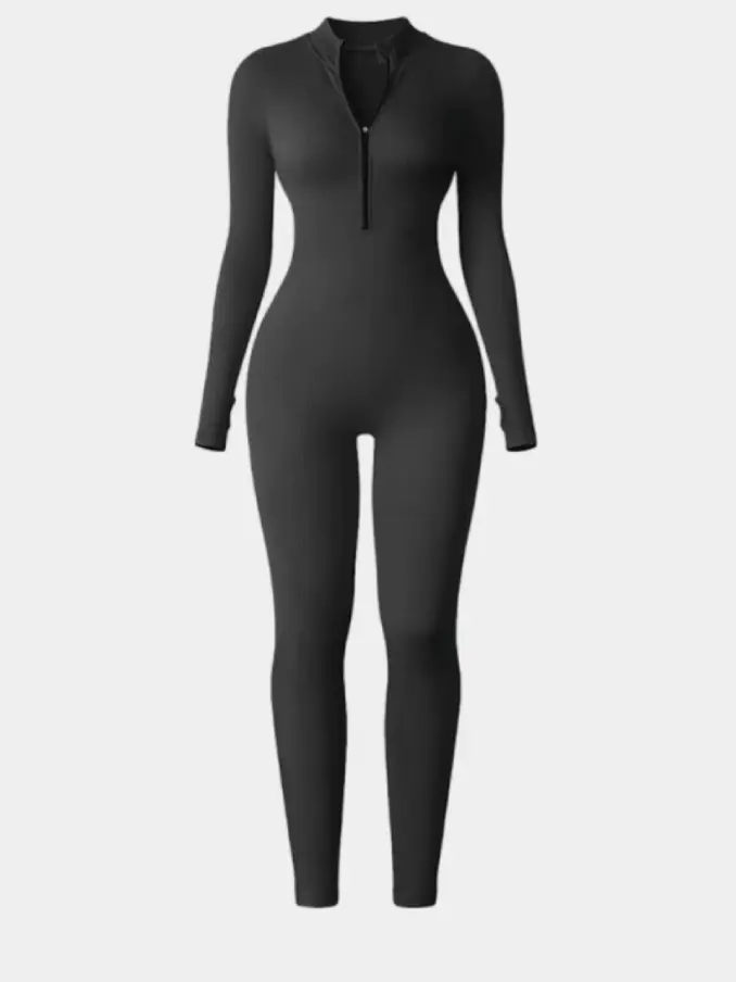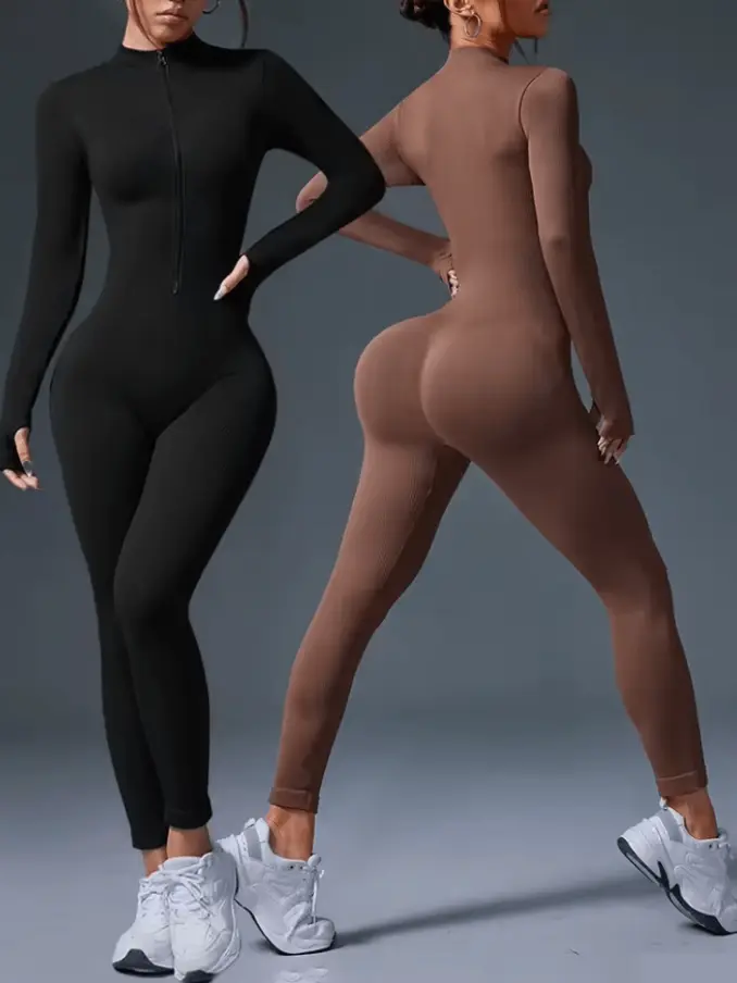 Summer Seamless Long Sleeve Thumb Hole High Elastic Women Bodysuits Fashion Ribbed Zipper Long Women's Jumpsuits Playsuits