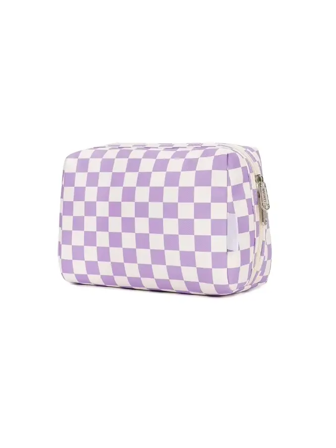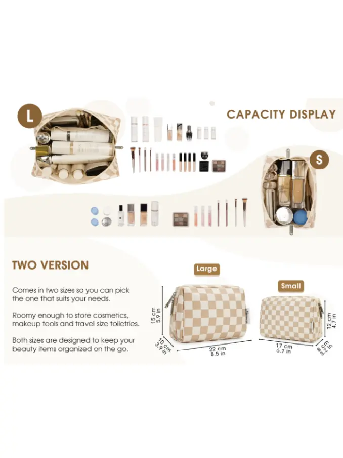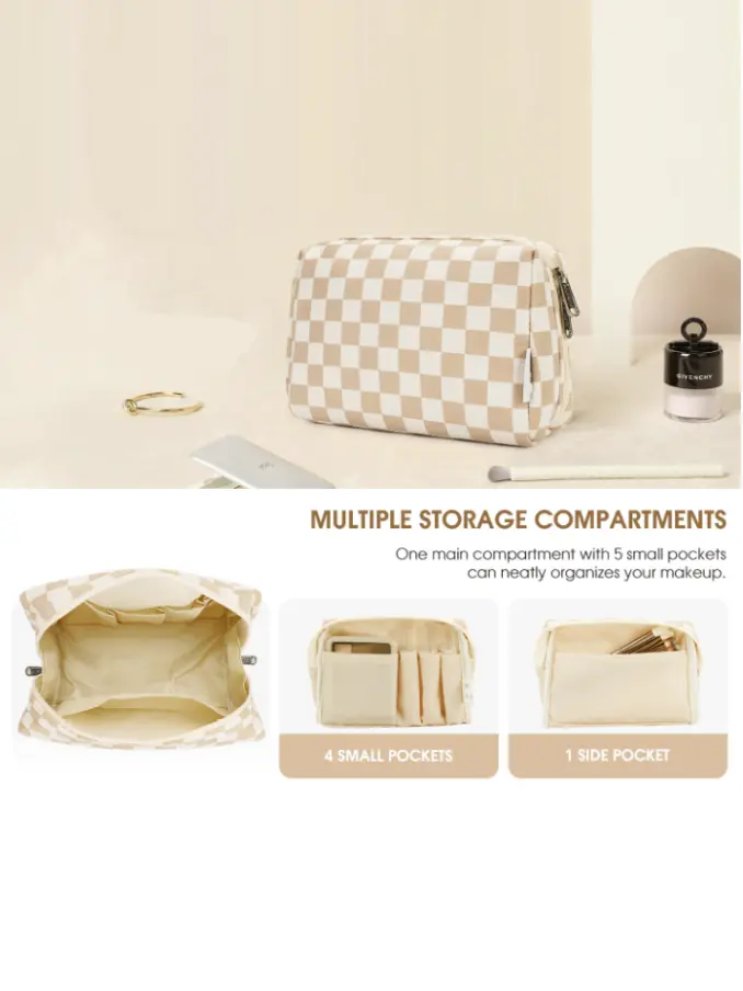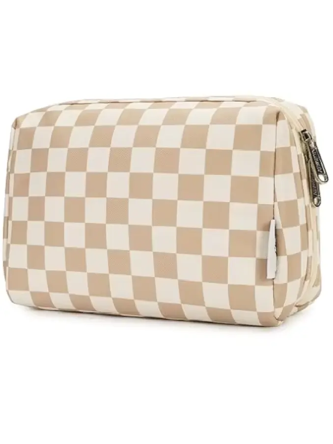 Women's Large Grid Makeup Bag with Zipper Closure PU Leather&polyester Travel Toiletry Storage Bag