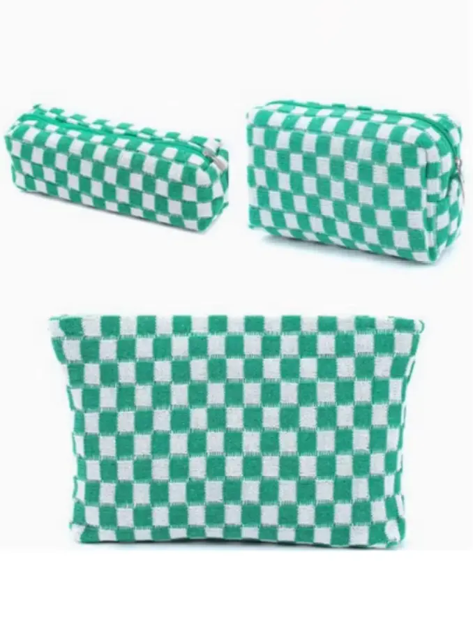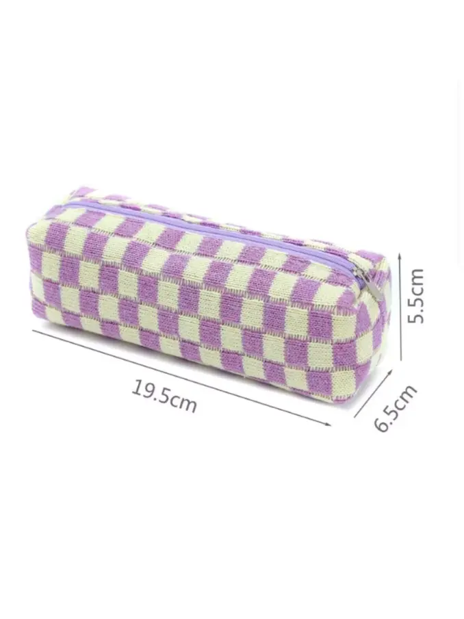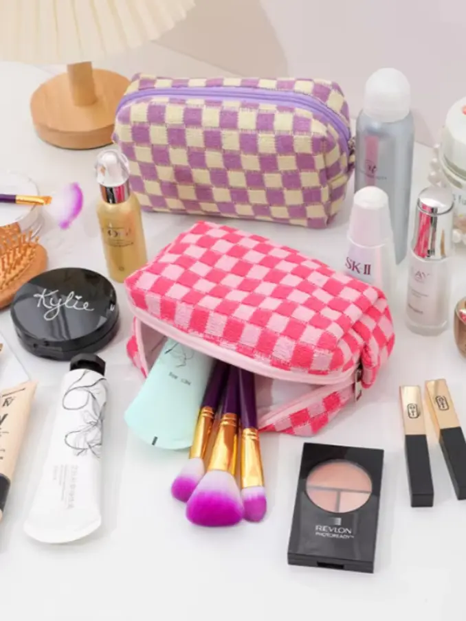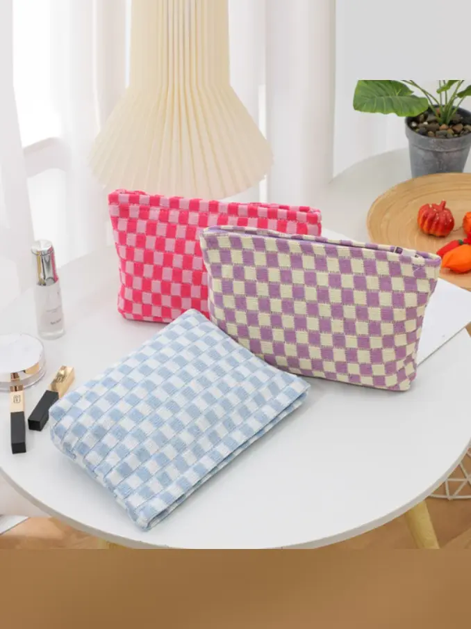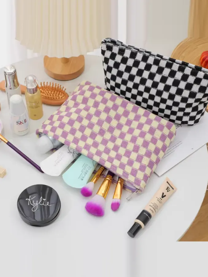 Large Capacity Portable Makeup Pouch Organizer Knitted Checkerboard Cosmetic Bag Women's Daily Travel Makeup
