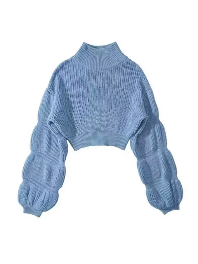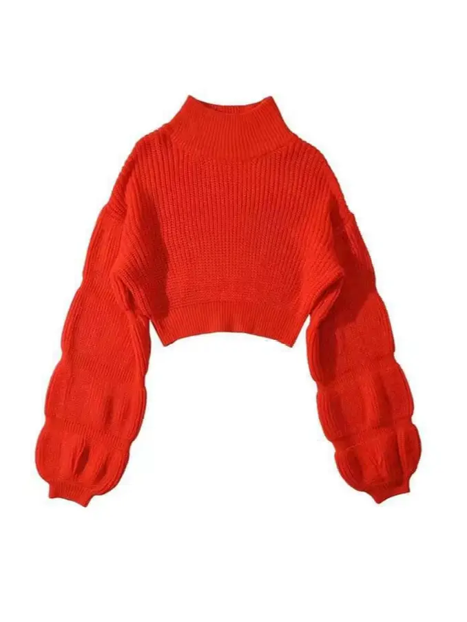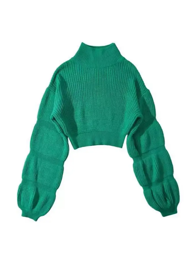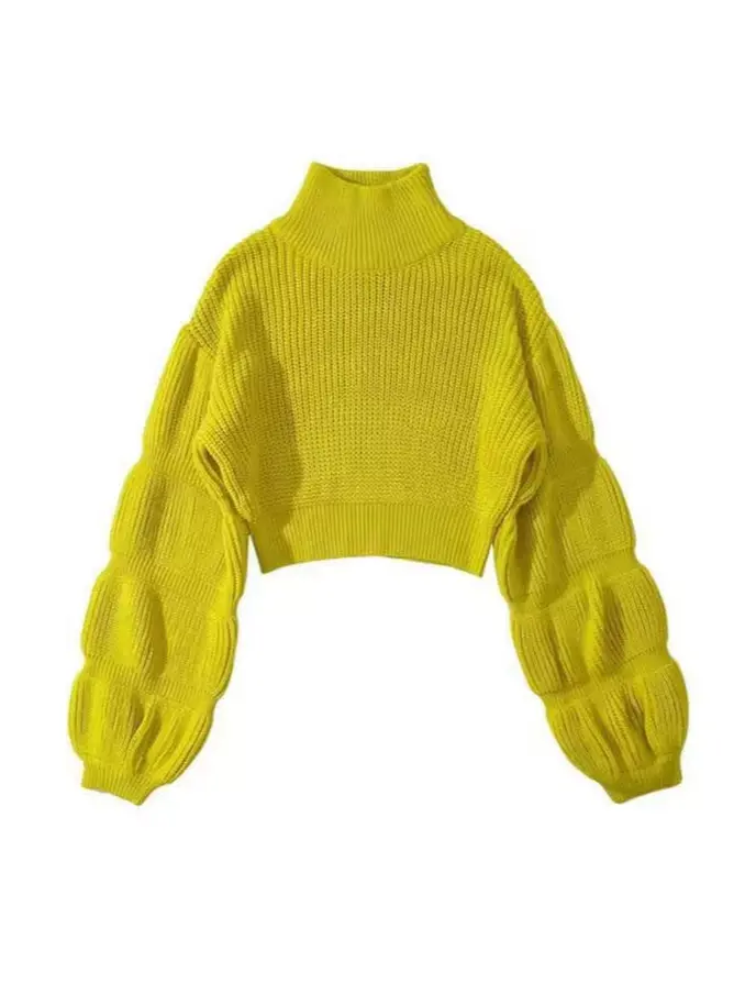 Colorway Turtleneck Bubble Sleeve Fashion Women Knitted Cropped Sweater