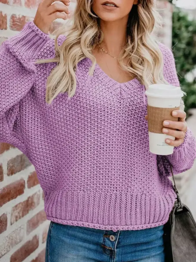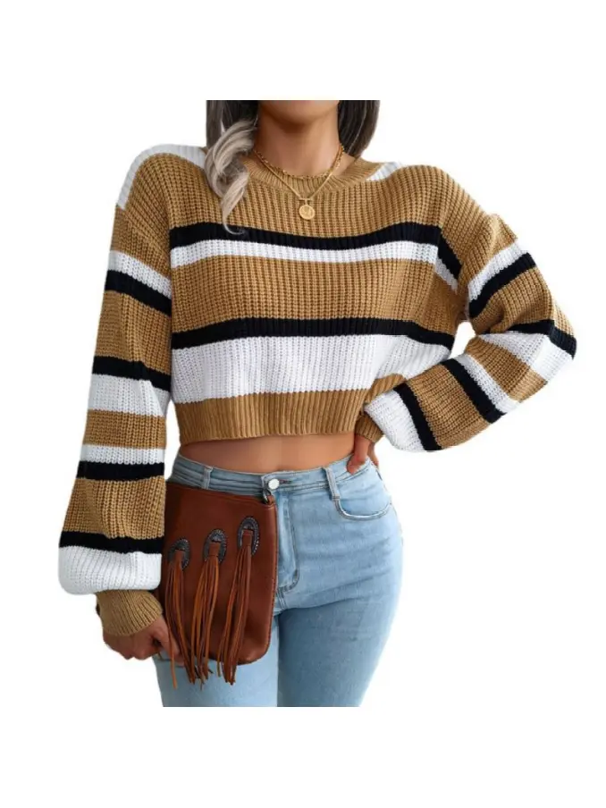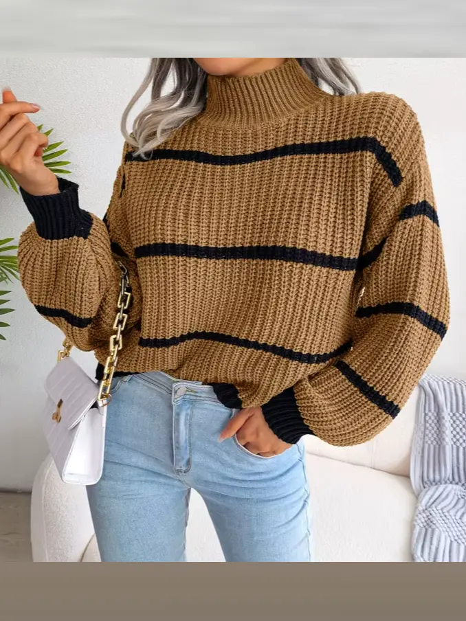 Leisure Striped Lantern Sleeve Semi-turtleneck Knitted Sweater Knit