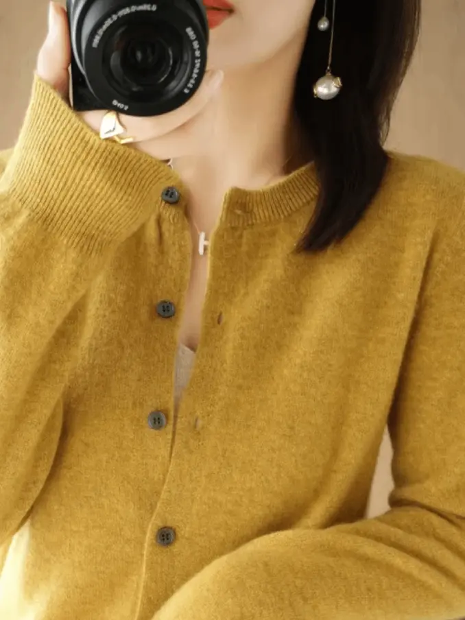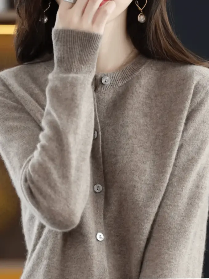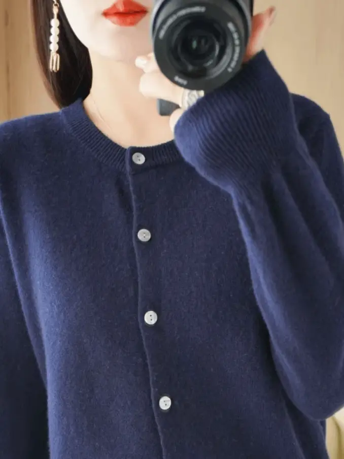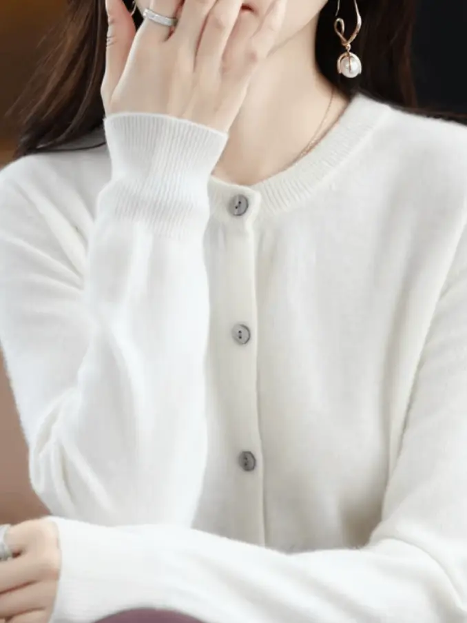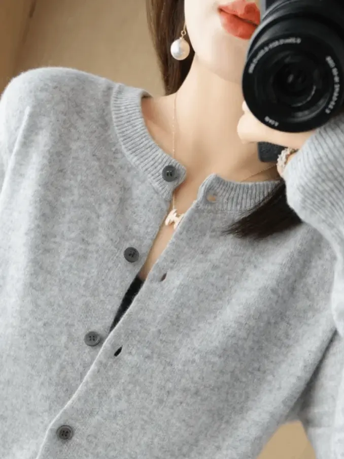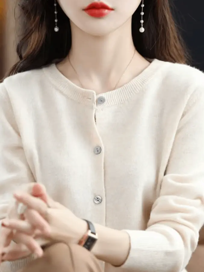 Women's Early Spring Versatile Solid Color Wool Knitted Cardigan Long-Sleeved Round-Neck Outerwear Fashionable Coat