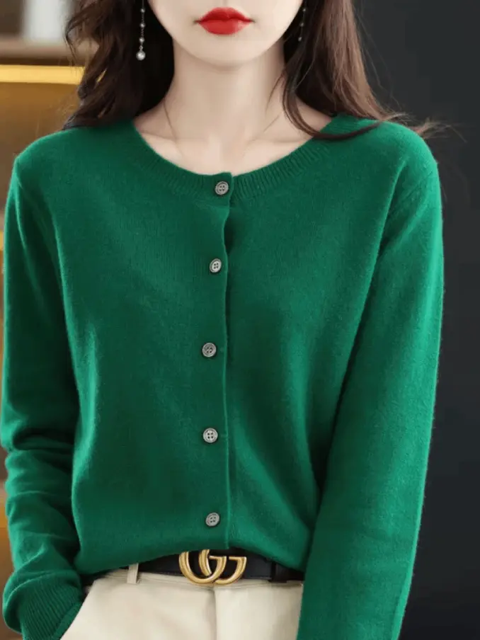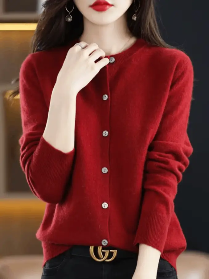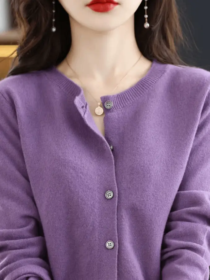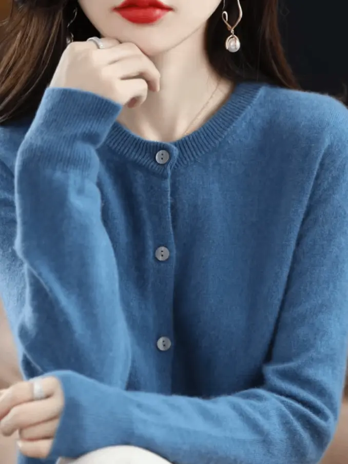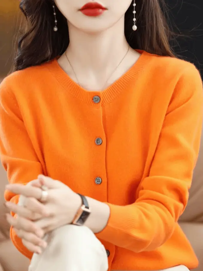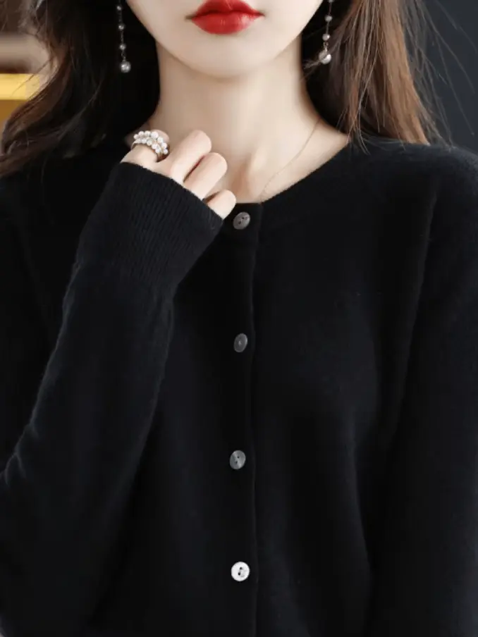 Women's Early Spring Versatile Solid Color Wool Knitted Cardigan Long-Sleeved Round-Neck Outerwear Fashionable Coat