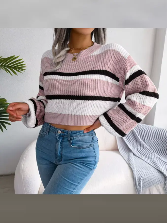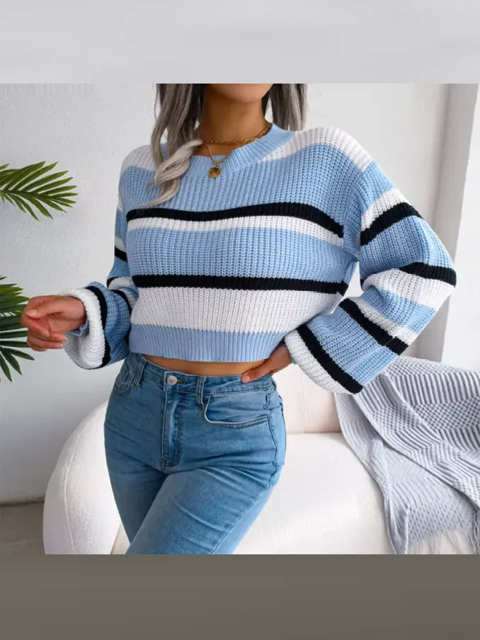 Spice Girl Suspender Off-the-shoulder Sweater Female Autumn New Korean Retro Striped Contrast Long-sleeved Short Sweater