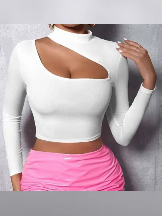 Women's One Shoulder Long Sleeve Cut Out Slim Fit Solid Crop Tee Tops