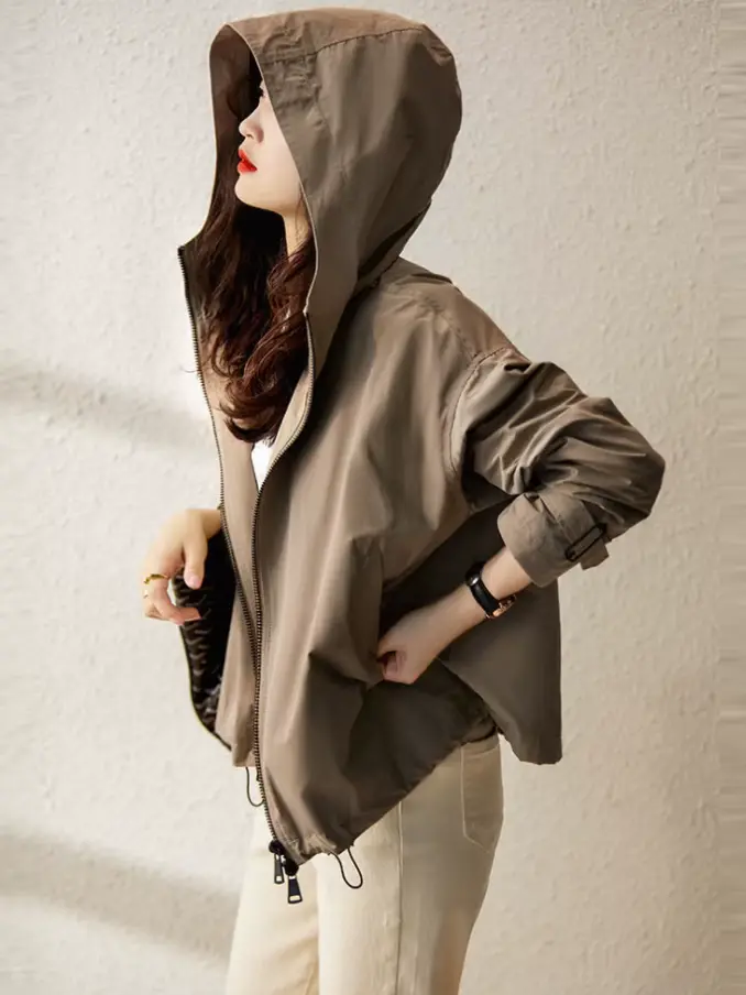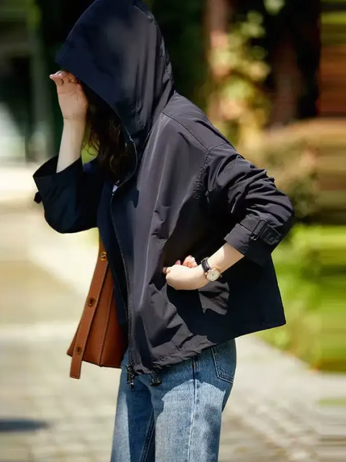Women's Elegant Korean Style Hooded Zipper Coat Fashionable Short Jacket Polyester Lining Casual Breathable