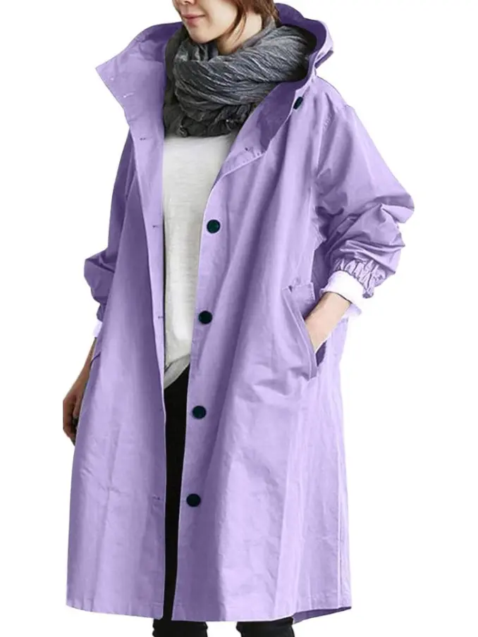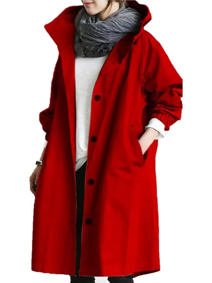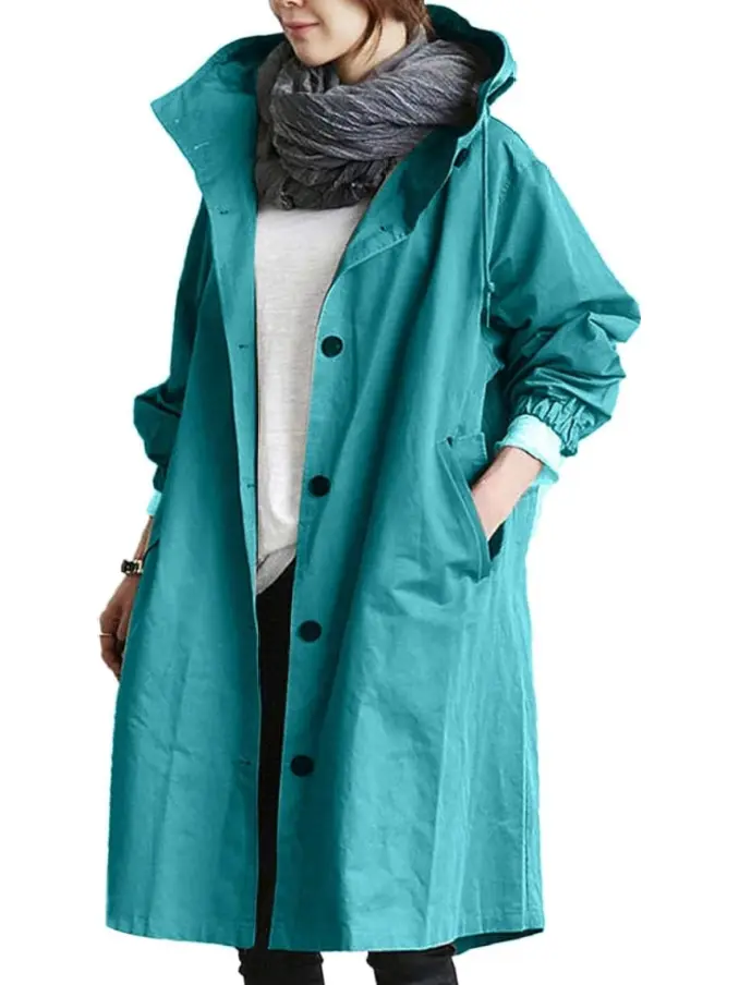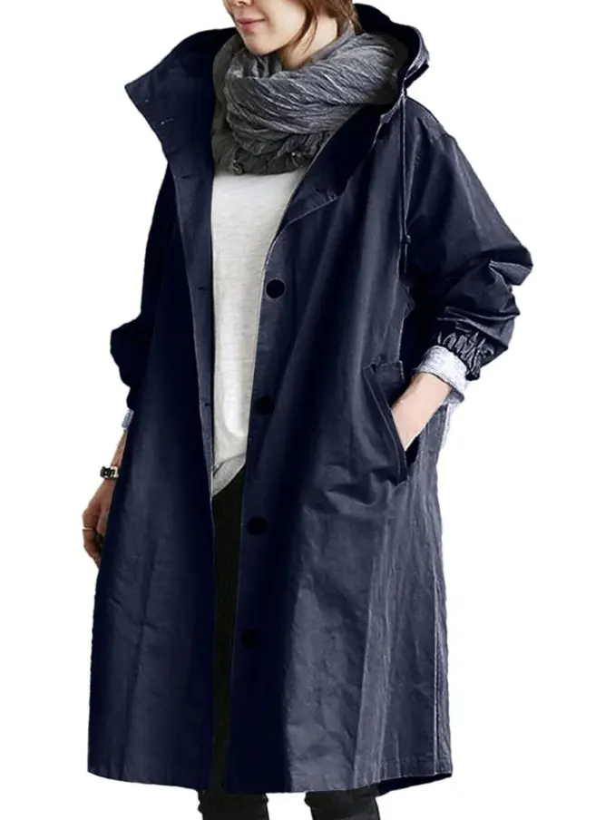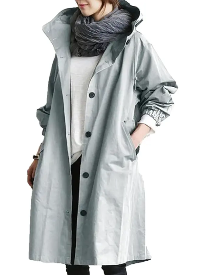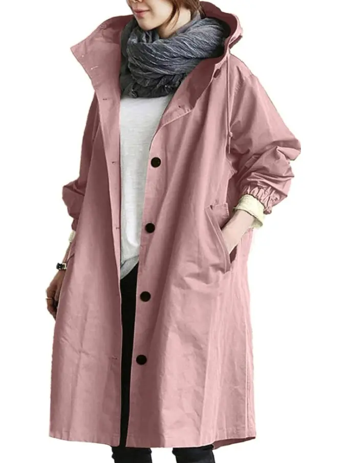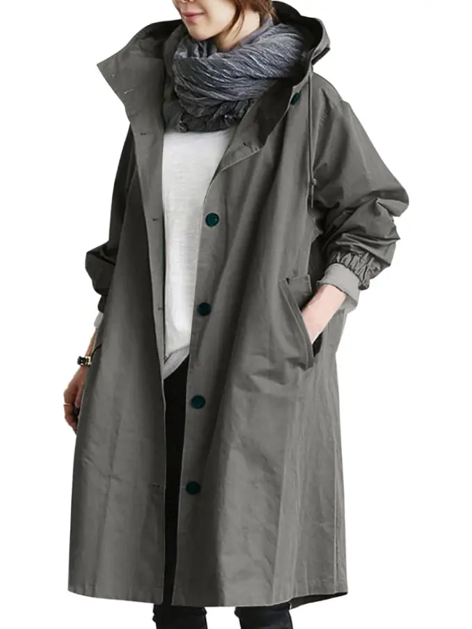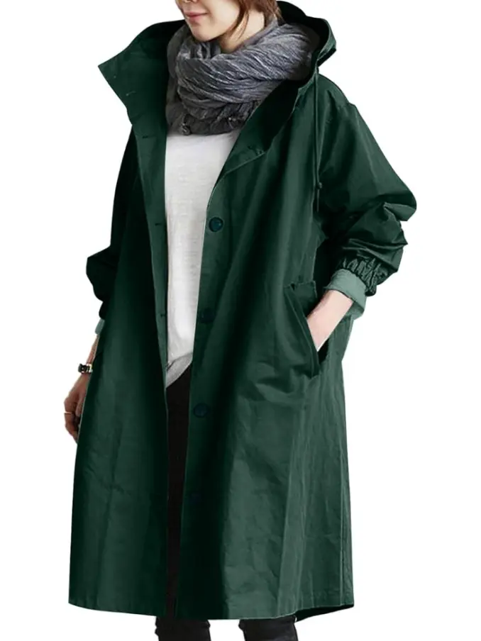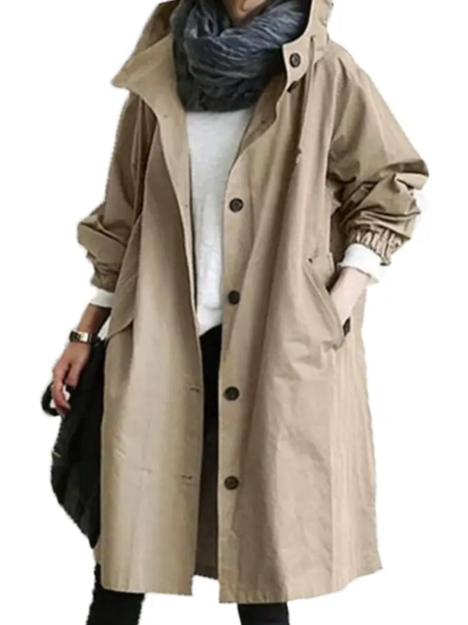 Women's Autumn Casual Long Sleeve Hooded Trench Coat Medium Length Loose Windbreaker Buttons Decoration Polyester