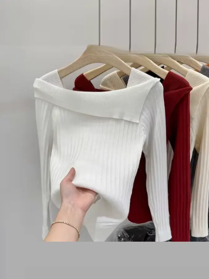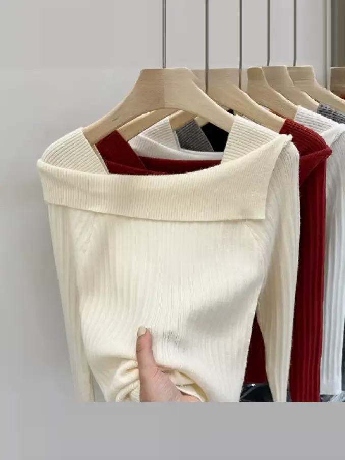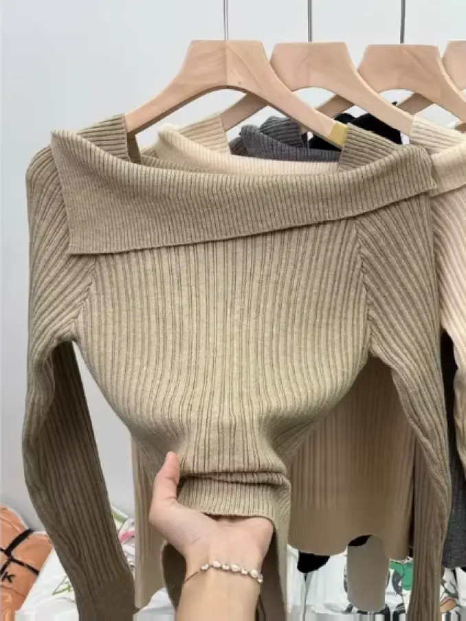 Women Slim Off Shoulder Slash Neck Long Sleeve Knit Sweaters