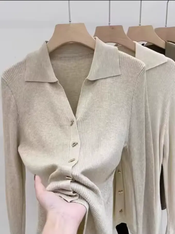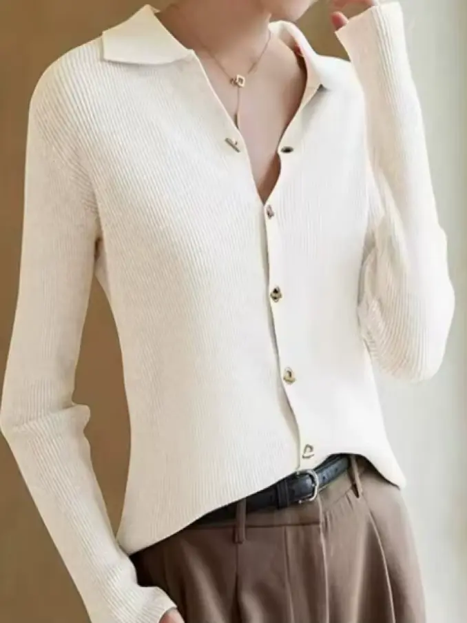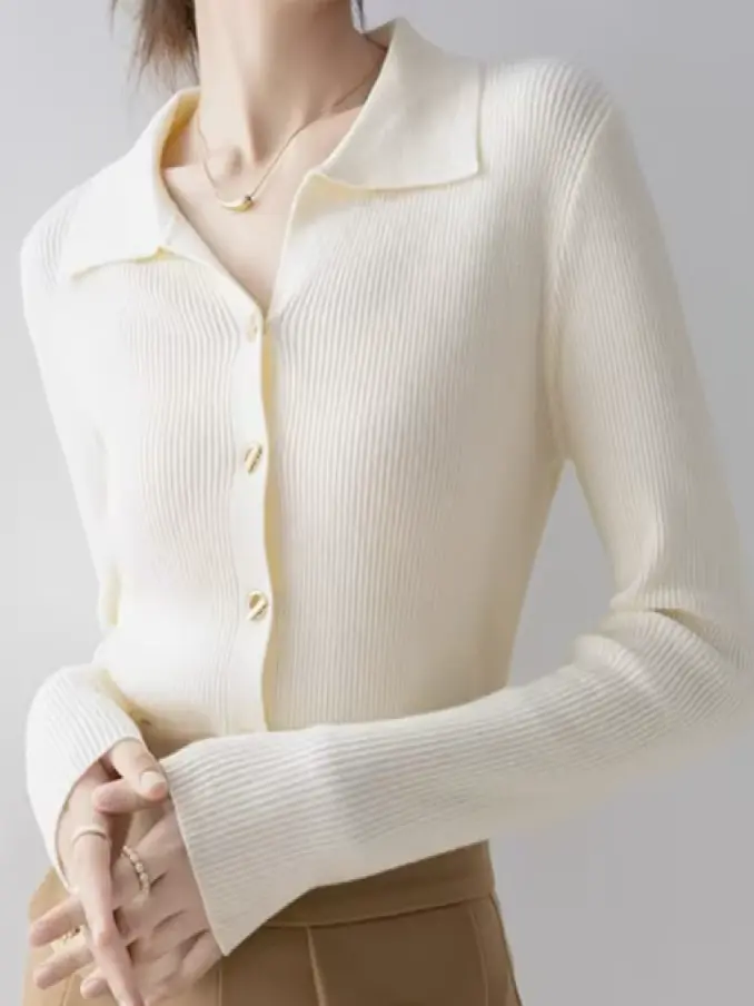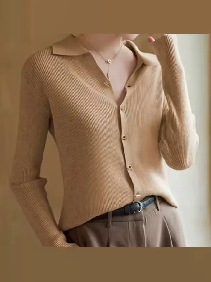 Fashion Turn Down Collar Button up Long Sleeve Knitted Cardigan Women Sweater