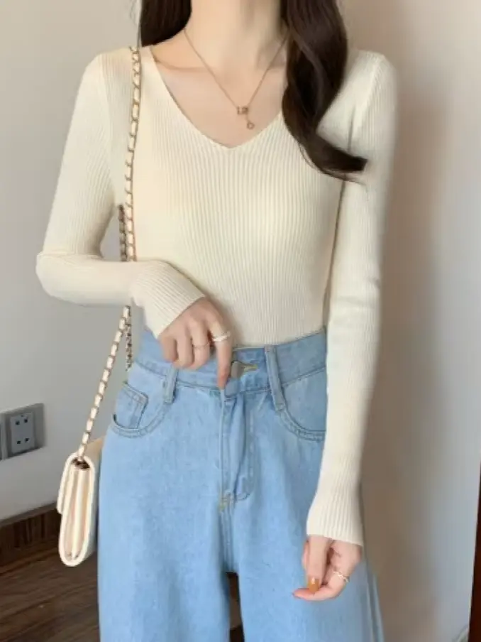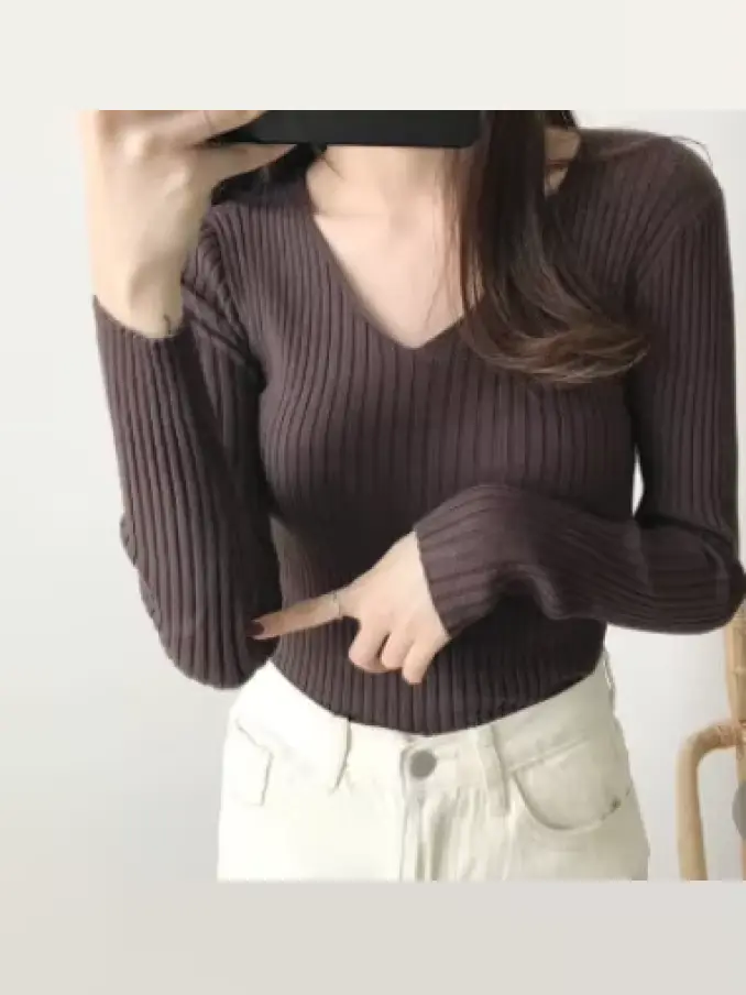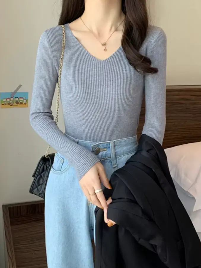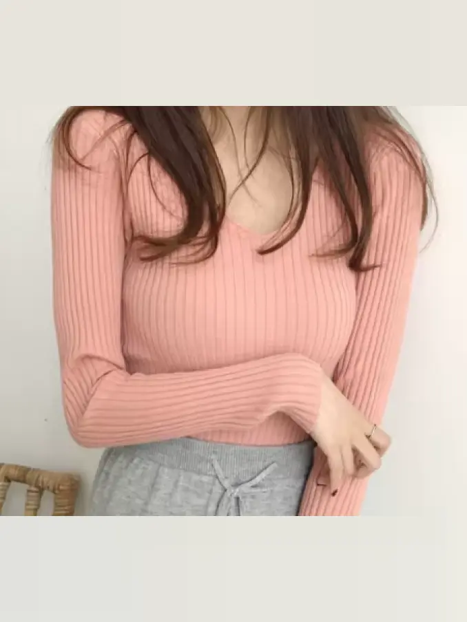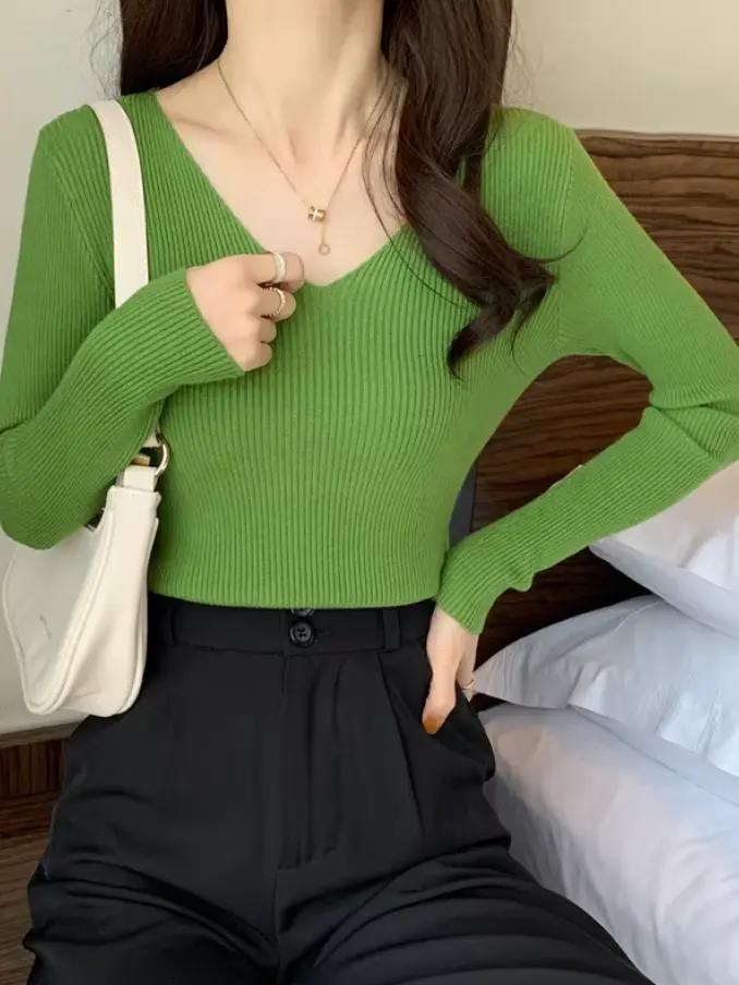 Women's Sexy V-Neck Pullover Knit Sweaters Front Thin Slim Fit Long Sleeves