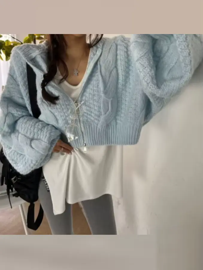 Women Autumn Long Sleeve Hooded Zipper Short Coat Streetwear Y2K Knitted Cardigan Sweater