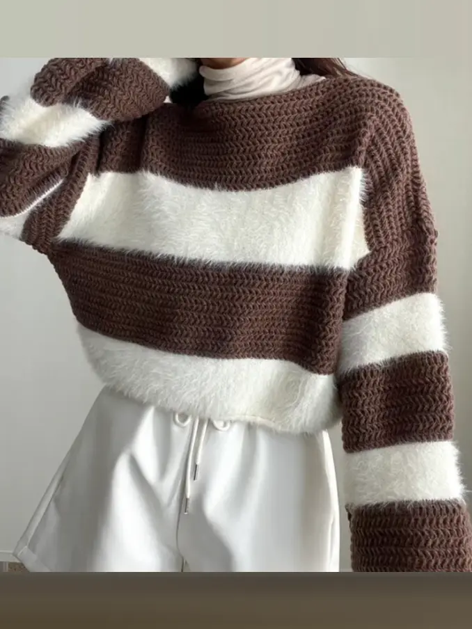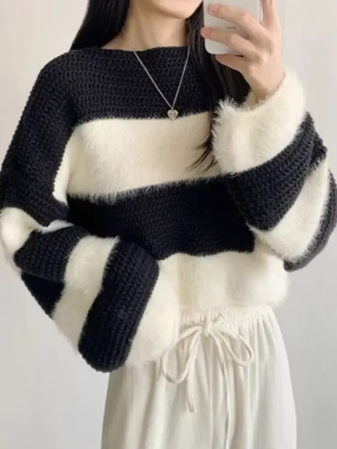 Women Casual O Neck Long Sleeve Striped Loose Knitwear Sweaters