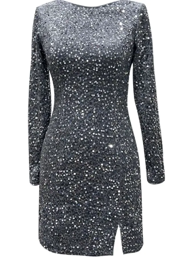 Women Sexy Backless Sequins Long Sleeves Round Neck Wrap Hips Evening Party Bodycon Mini Dress