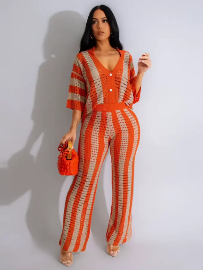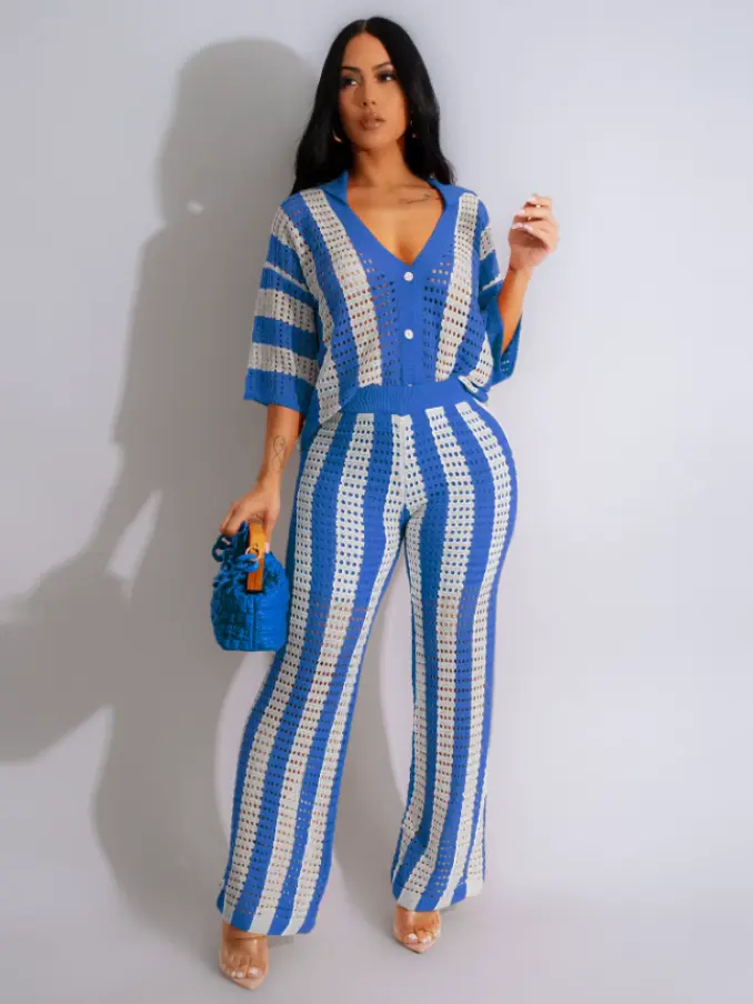 Casual Half Sleeve Cardigan and Vacation Stripe Hollow Out Wide Leg Pants Set