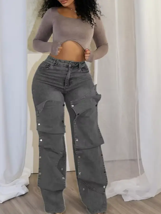 Women's Streetwear Denim Cargo Pants Wide Leg Button Front Straight Jeans Fashion Party Trousers