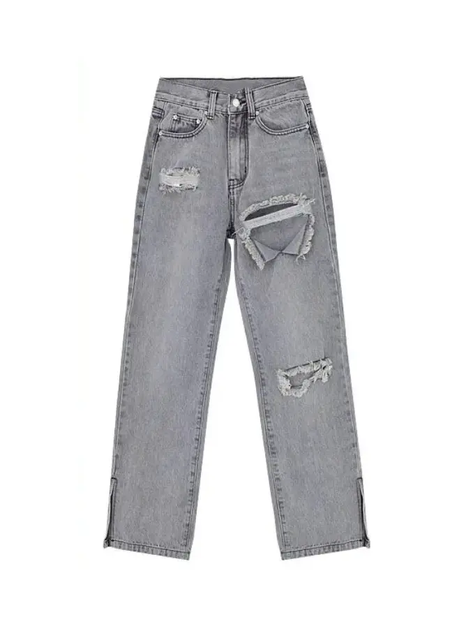 Streetwear Women Casual High Waist Hole Straight Pants Jeans
