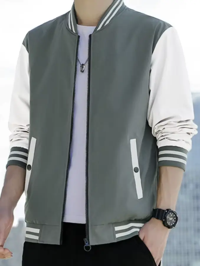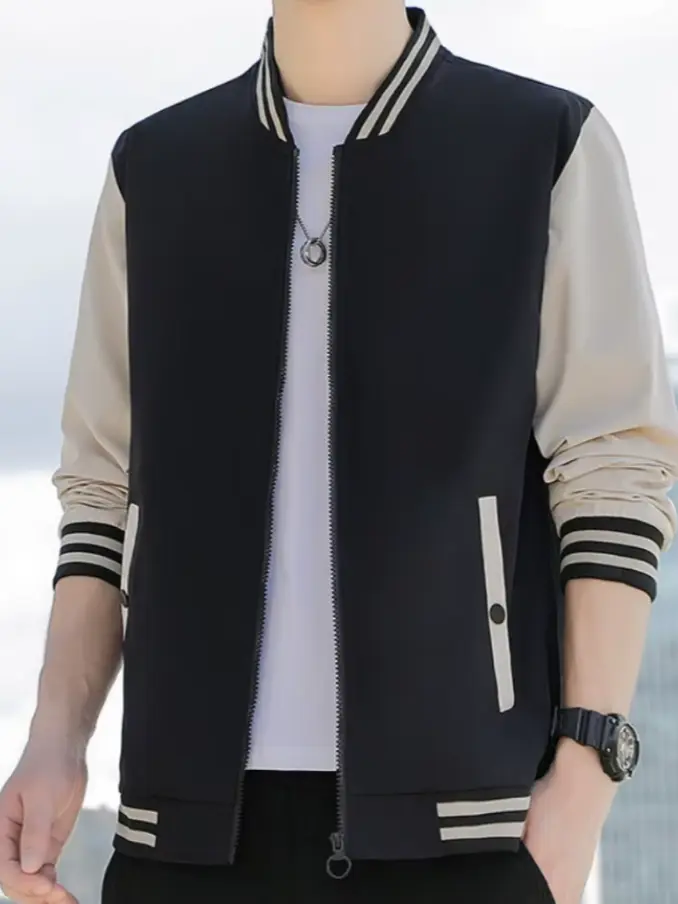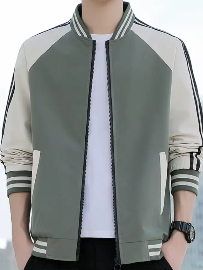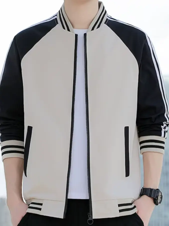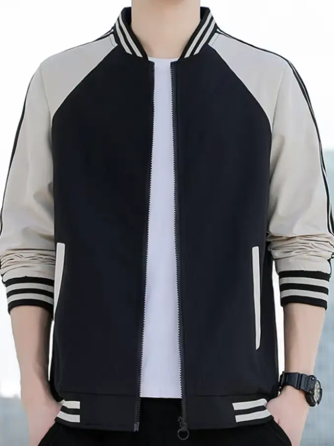 Men's Striped Patchwork Bomber Jacket - Slim Fit Streetwear Coat Standard Collar, Fashionable & Breathable for Casual Outfits