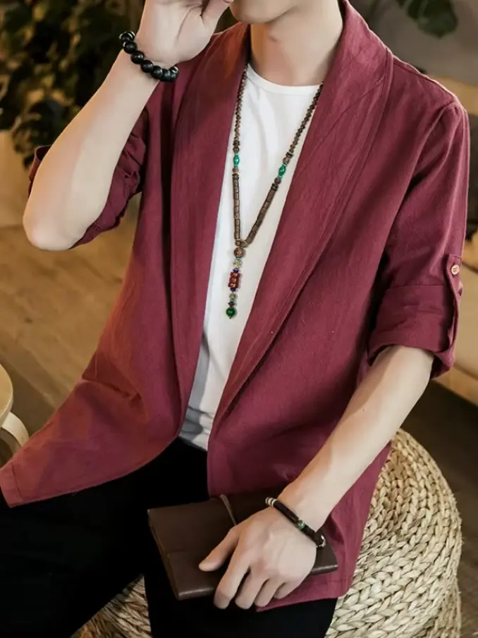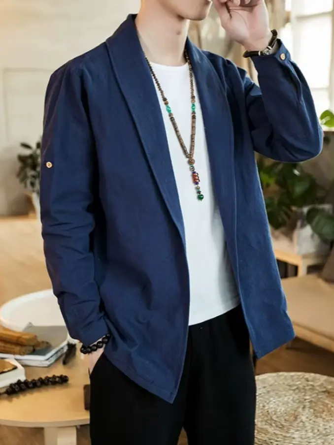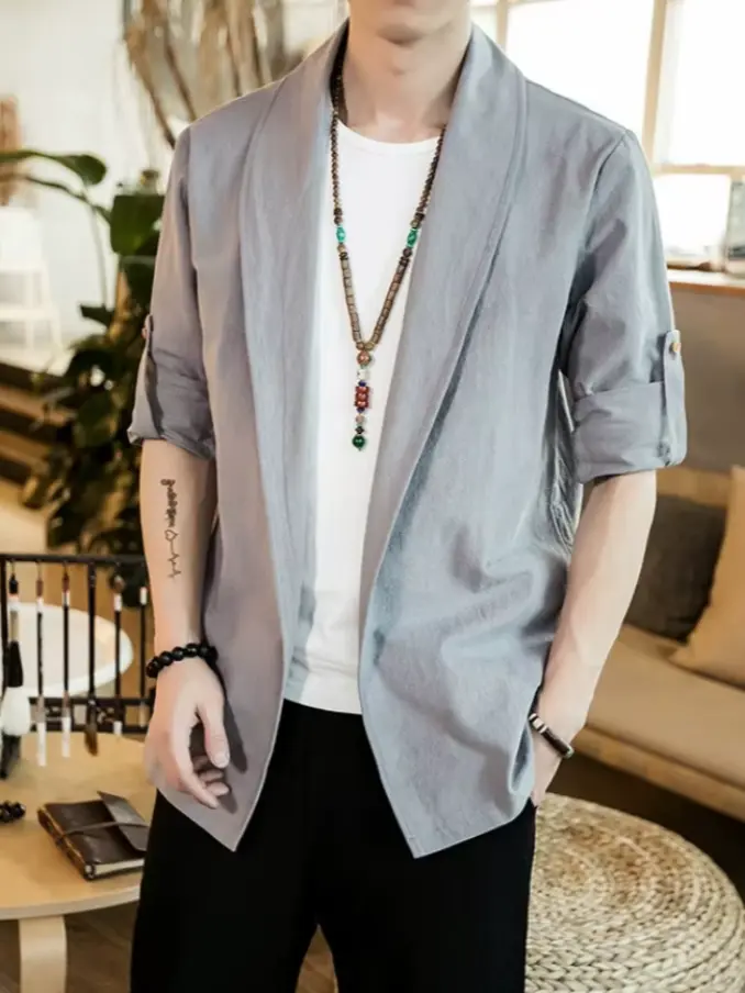 Men Lightweight Kimono Jacket Cardigan - Open Front Long Sleeve Coat, Cotton Linen Blend, Casual Summer Cover-Up, Loose Fit