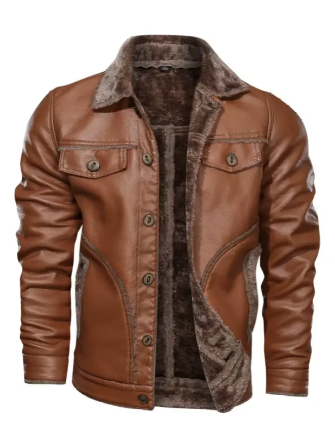 Men Casual Thick PU Leather Coat Fur Fleece Jacket