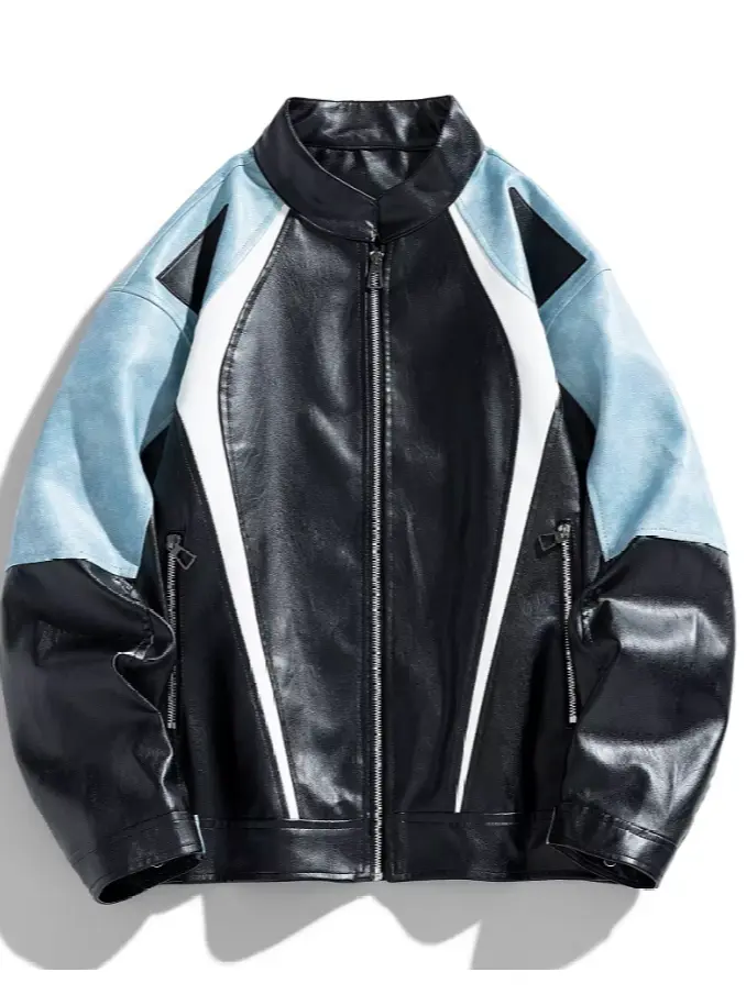 Men Casual Zipper Patchwork Color Leather Biker Jackets Outerwear Coat