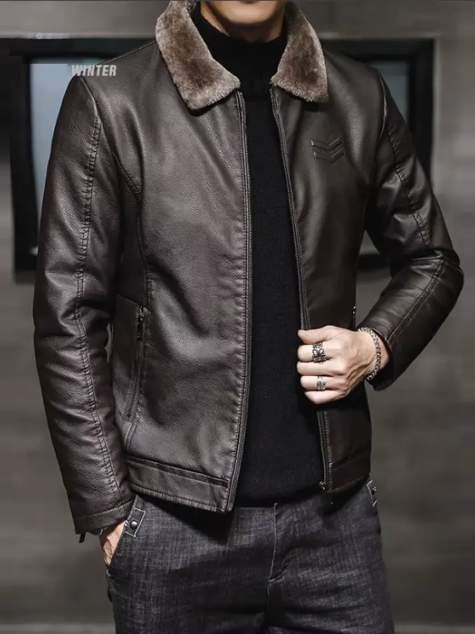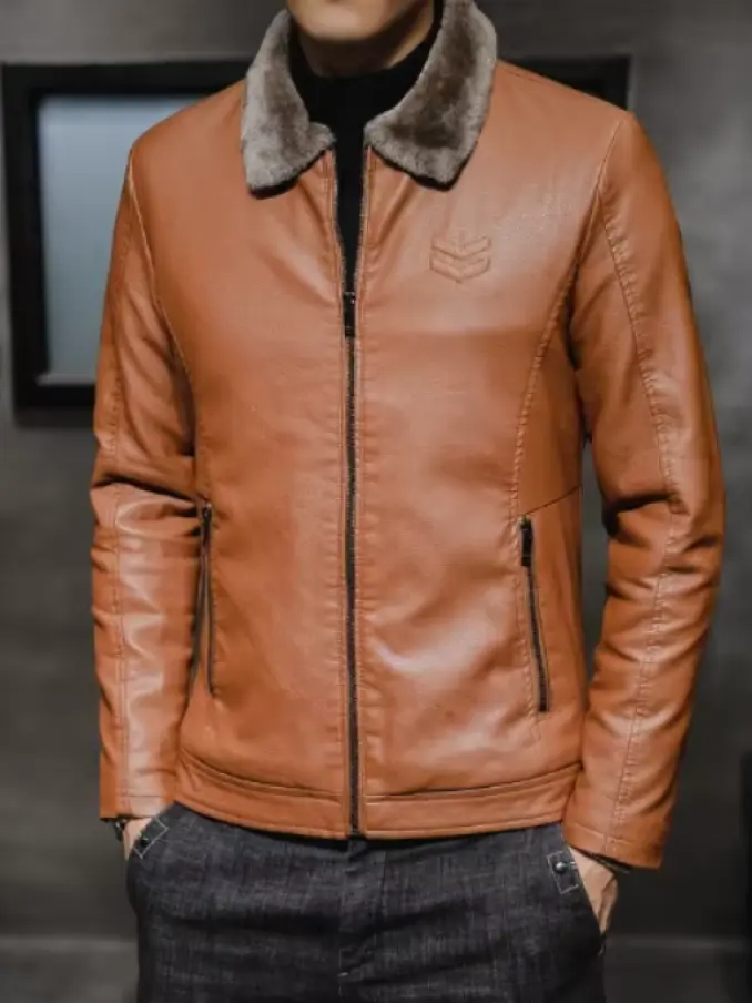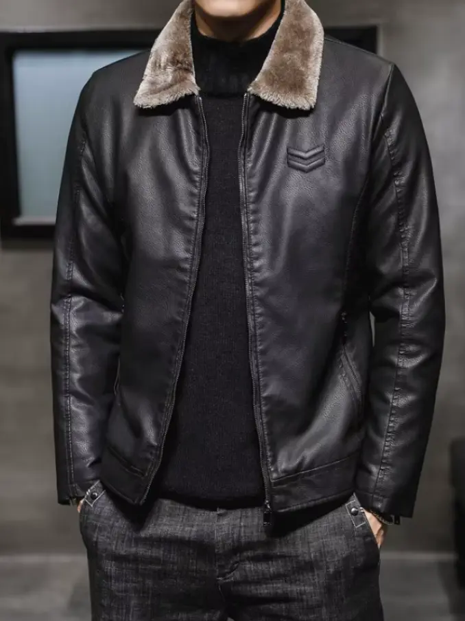 Men's Jacket Thick Leather with Faux Fur Collar Windproof Warm Coat