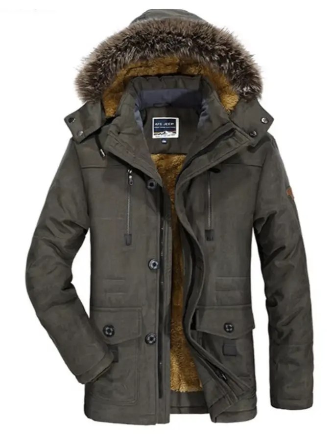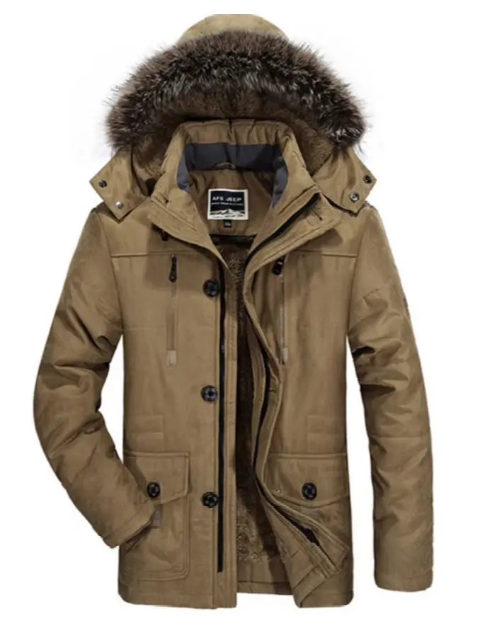 Men Hooded Fur Collar Thick Mid Length Cotton Jacket