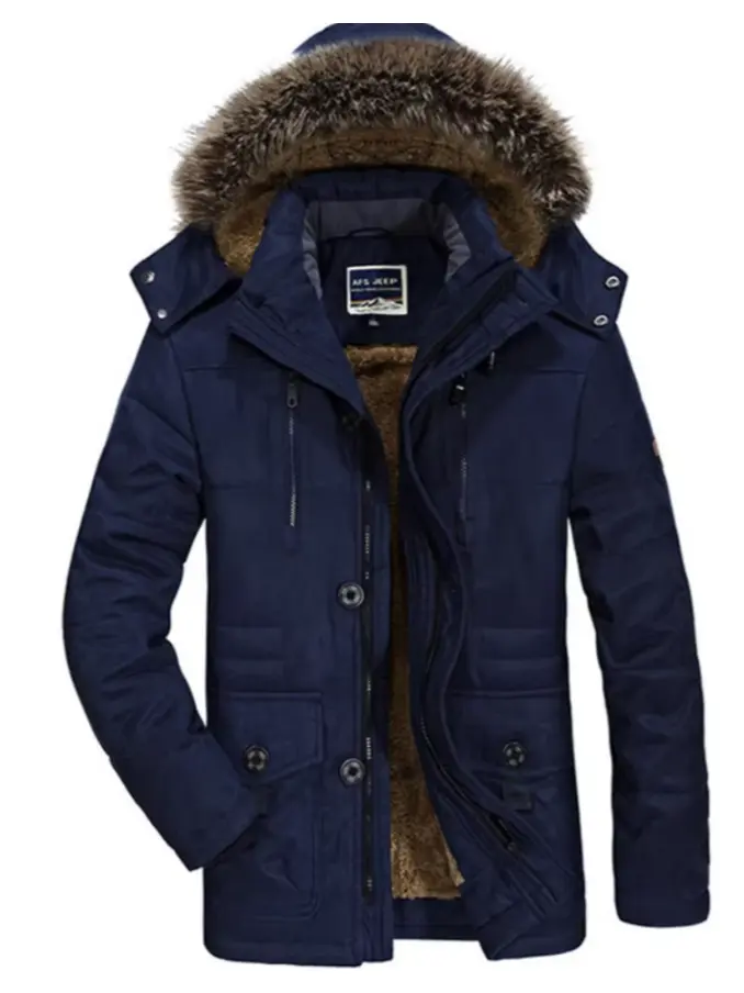 Men Clothing Hooded Fur Collar Thick Mid Length Cotton Jacket Coats