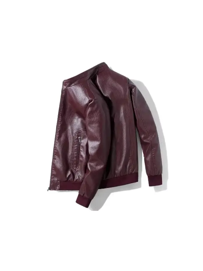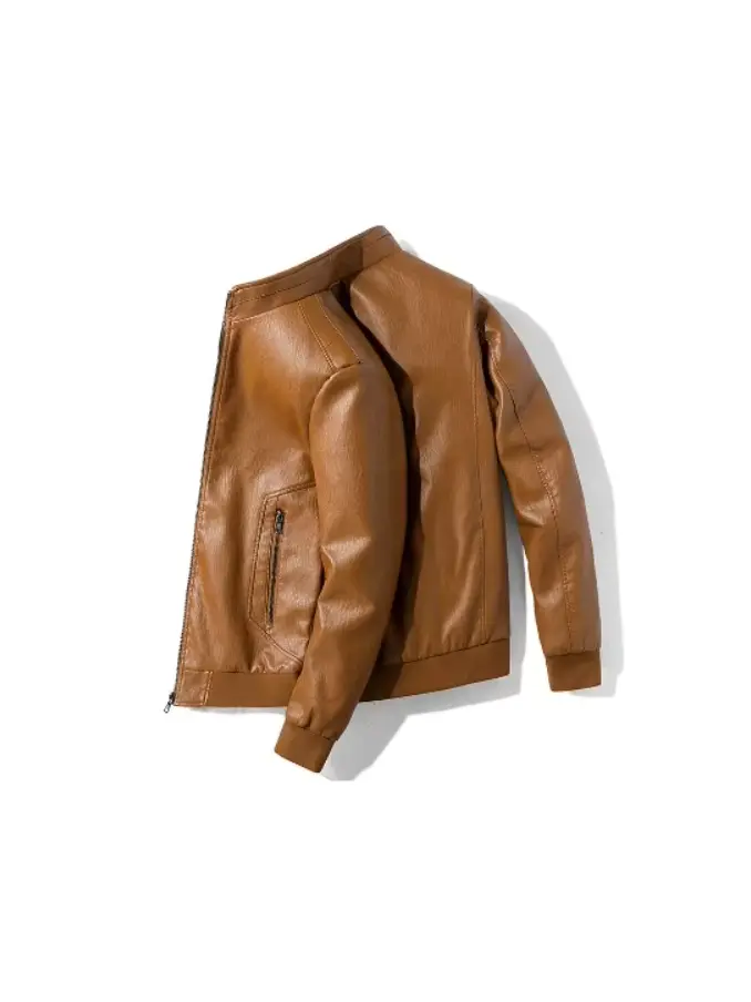 Men's Casual Solid Color Stand Collar PU Leather Jacket