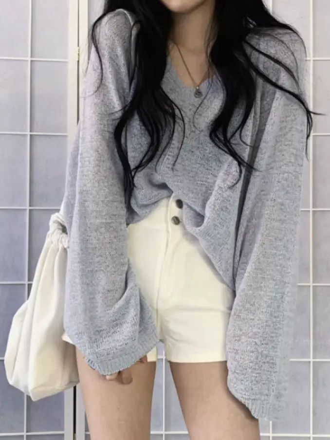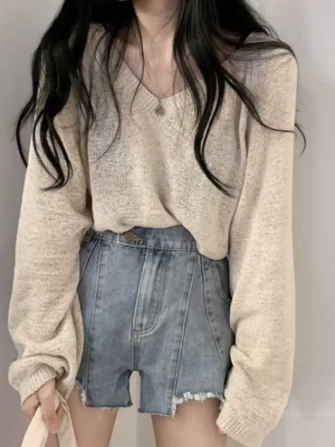Women's Knitted Pullover - Korean Long Sleeve Vintage Top, Fall Loose V Neck Casual Sweaters