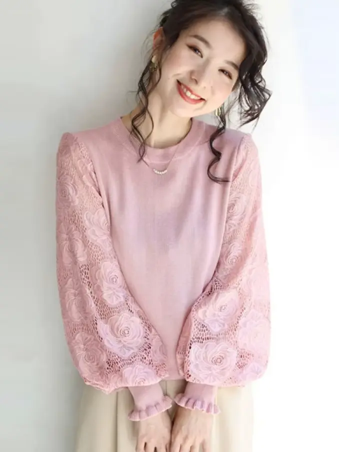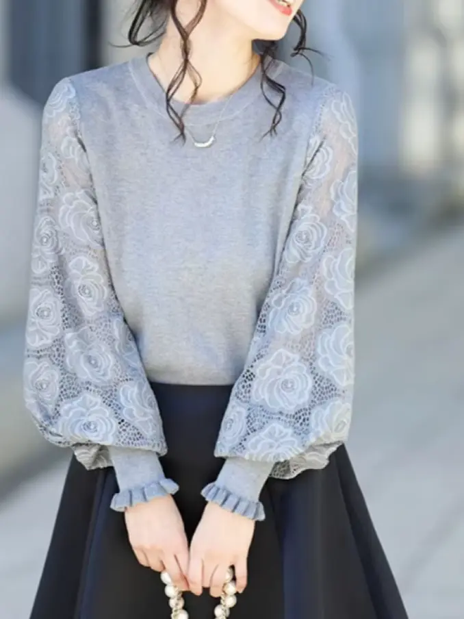 Women's Lace Knitted Sweater - Lantern Sleeve Round Neck Top