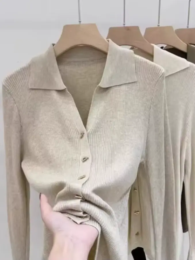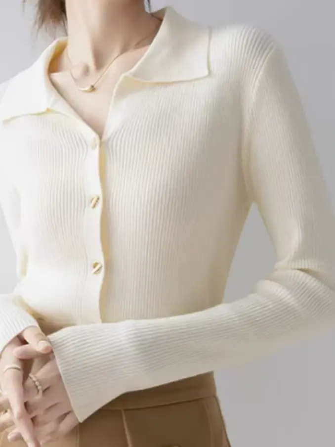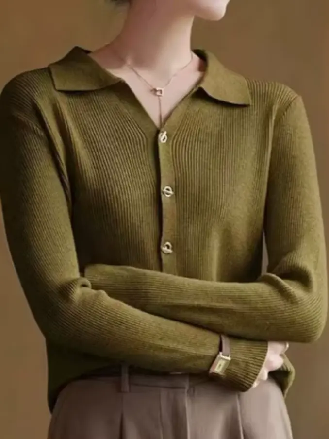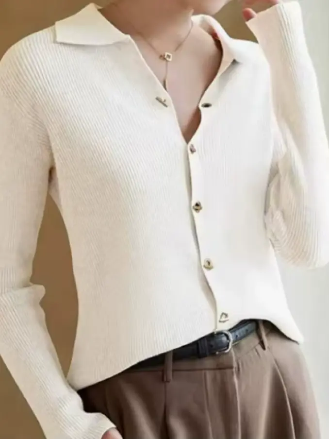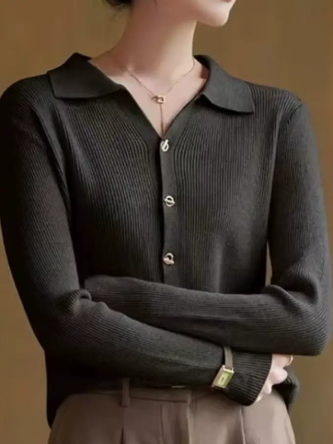 Turn Down Collar Button up Long Sleeve Knitted Cardigan Women Sweater