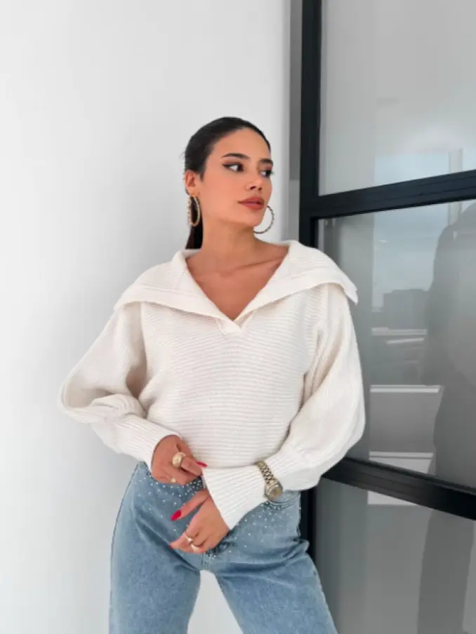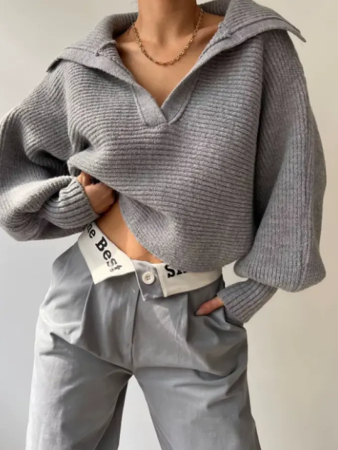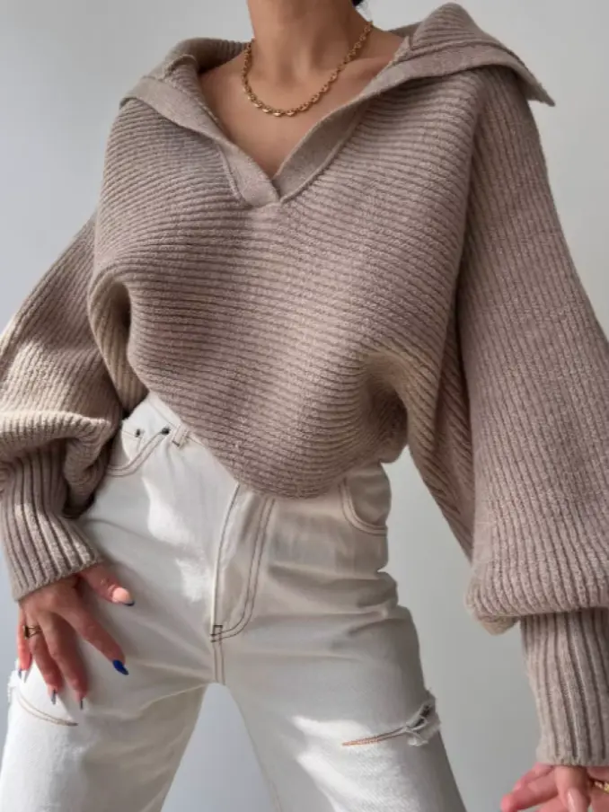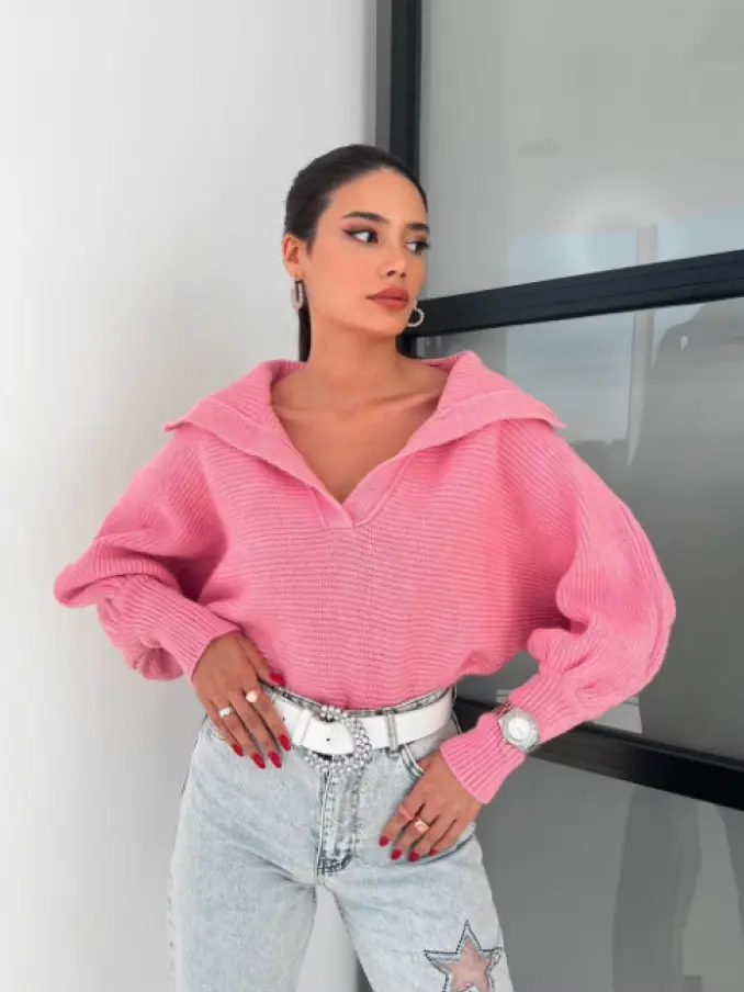 Women Casual V Neck Lantern Sleeve Pullover Lady Elegant Short Sweater