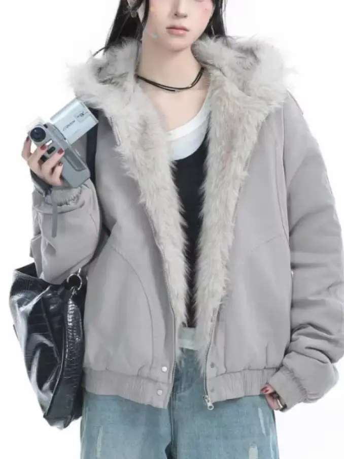 Women's Hooded Jacket - Fur Collar Plush Coat, Retro Streetwear Loose Fit, Style Warm Outerwear