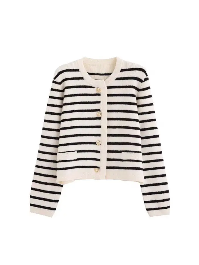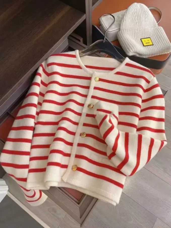V-neck Color Clashing Solid Knitted Casual Front Logo Women's Cardigan Spring Autumn French Loose Short