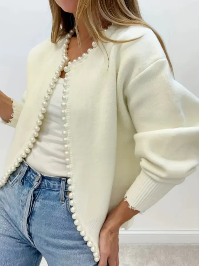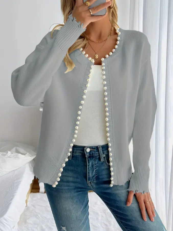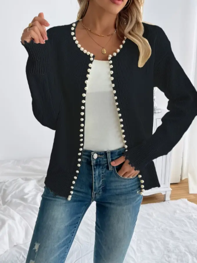 Women Casual Pearl Trim Cardigan Winter Fashion Knitwear Ladies Solid Color Knitting Cardigan Sweater Woman