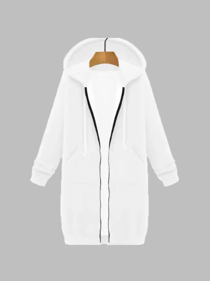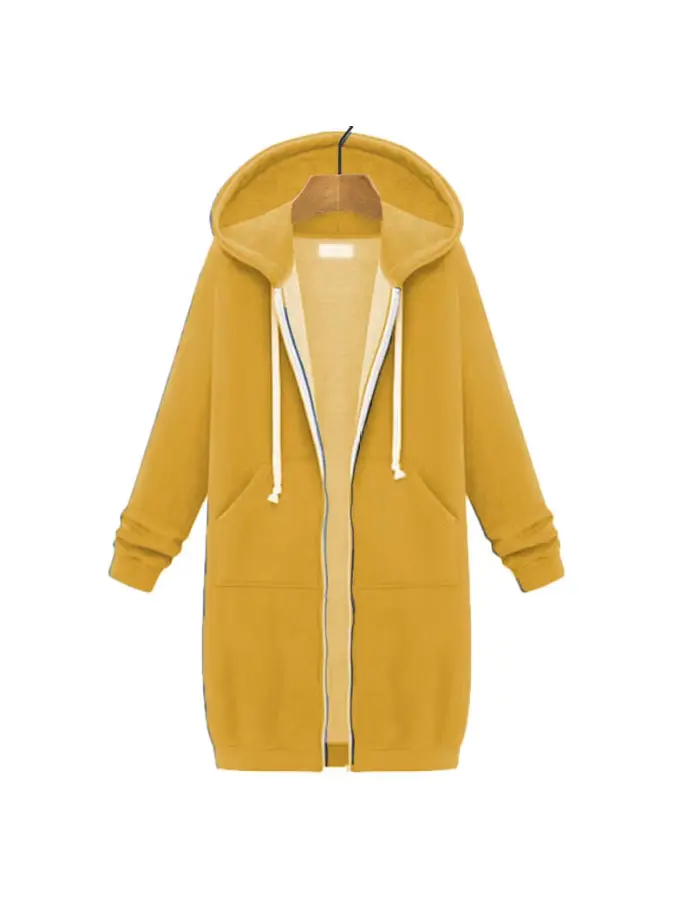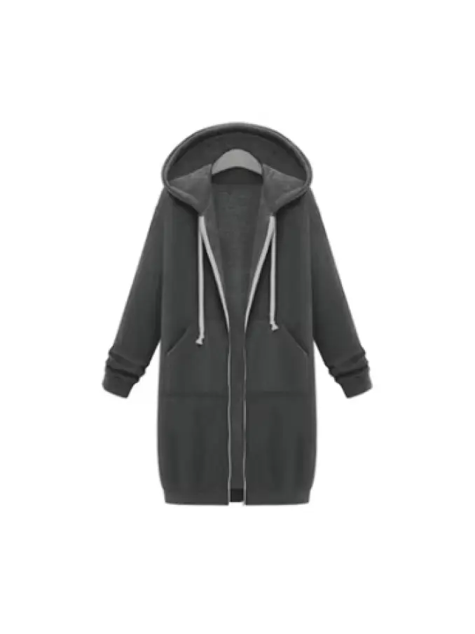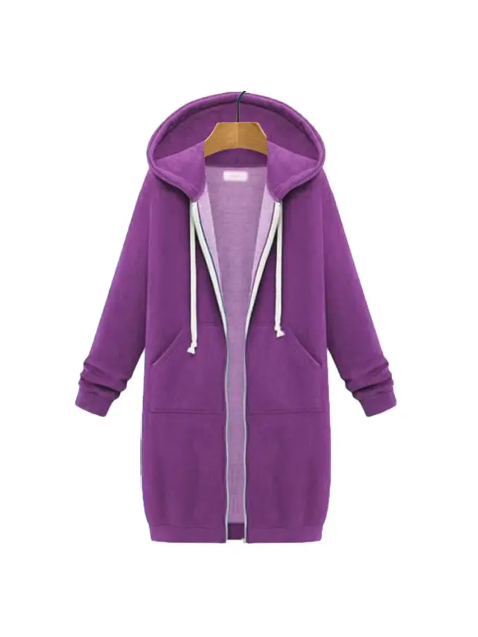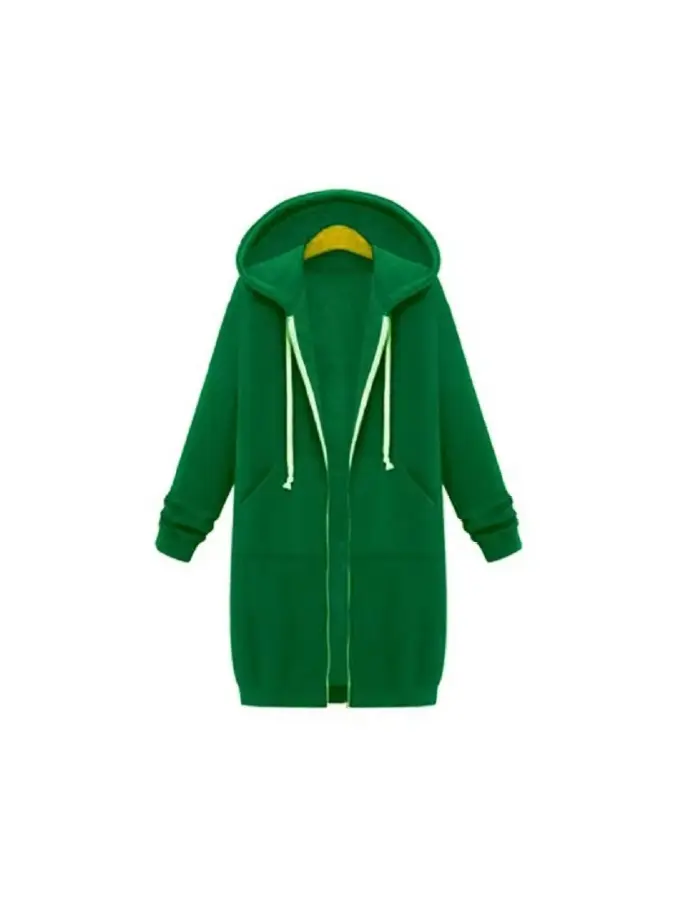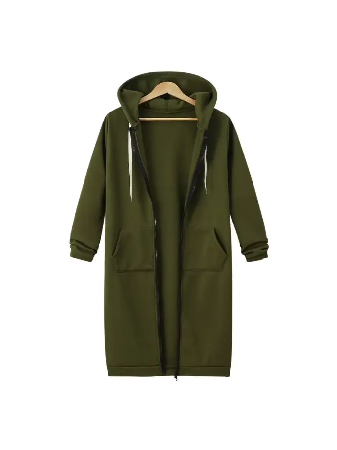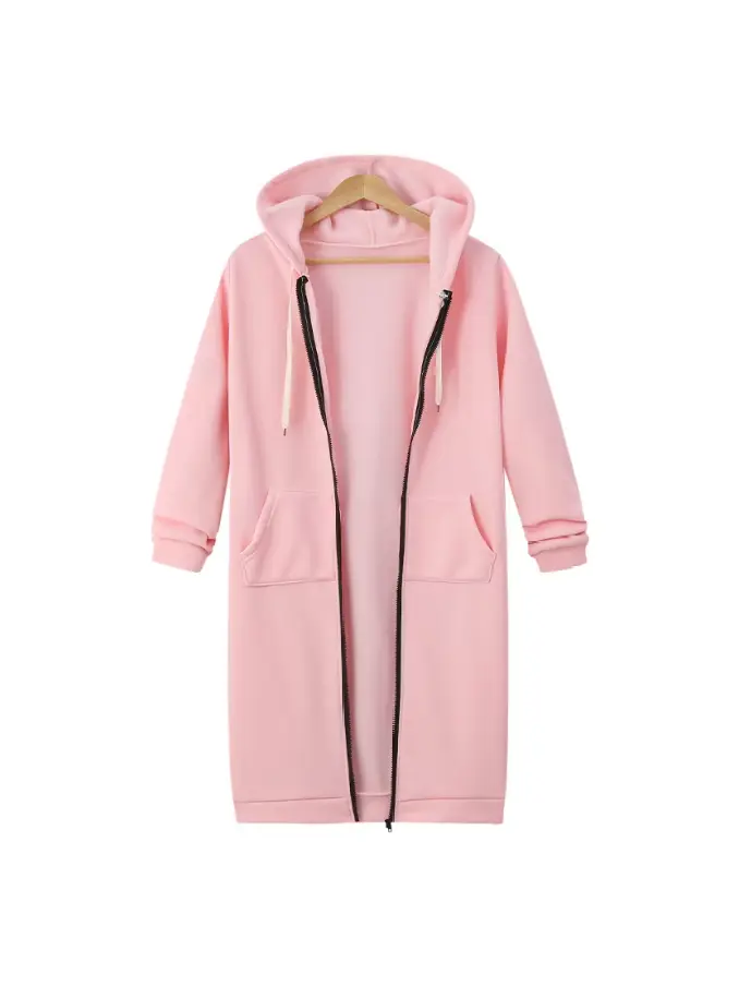 Women's Long-Sleeved Mid-Length Sweatshirt Hooded Fleece Jacket Solid Pattern Long Coat
