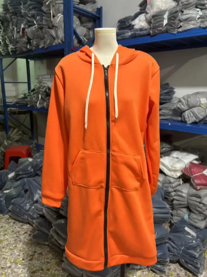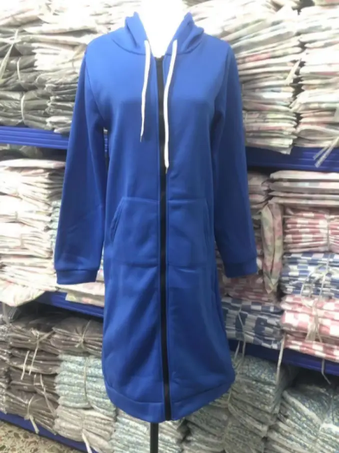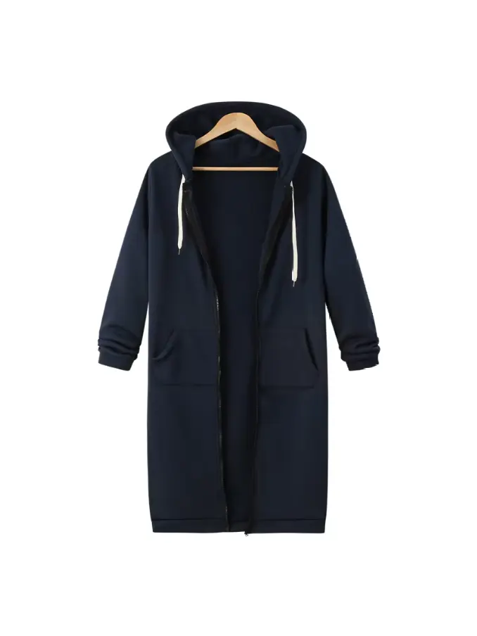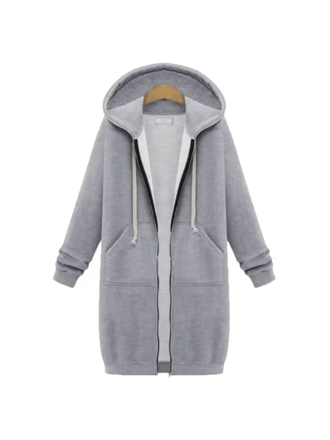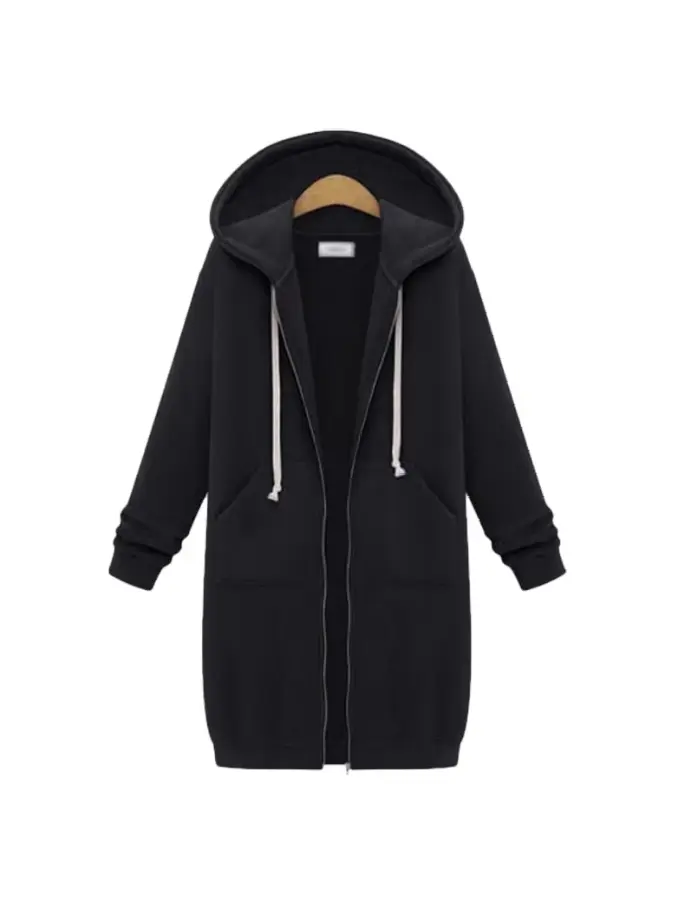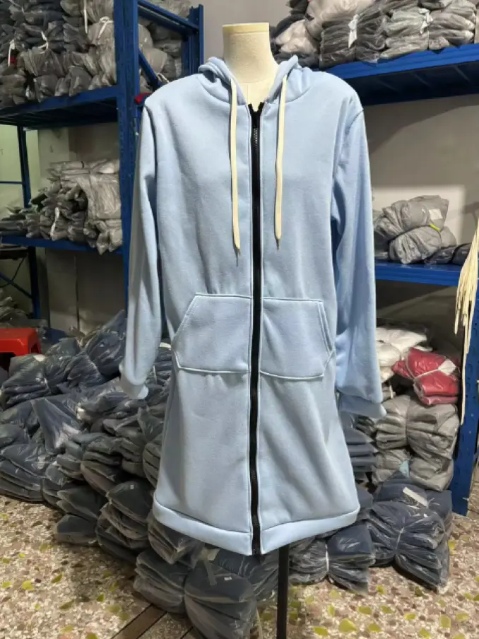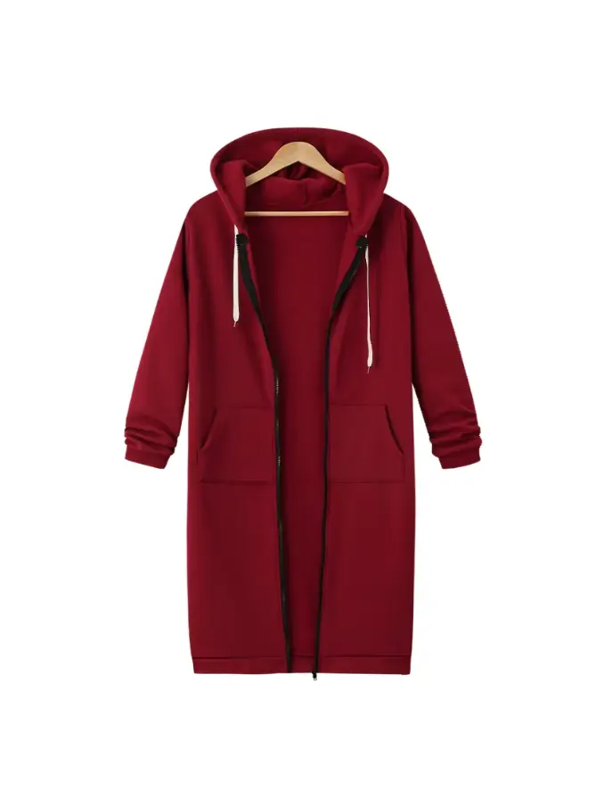 Women's Long-Sleeved Mid-Length Sweatshirt Hooded Fleece Jacket Solid Pattern Long Coat