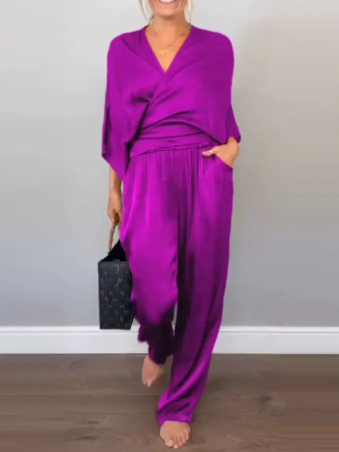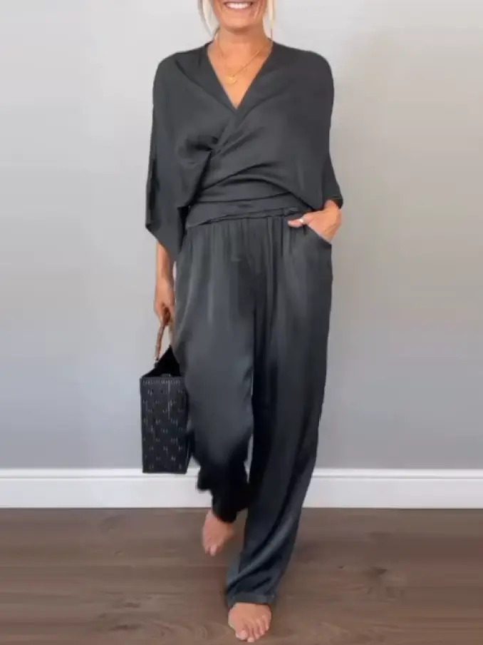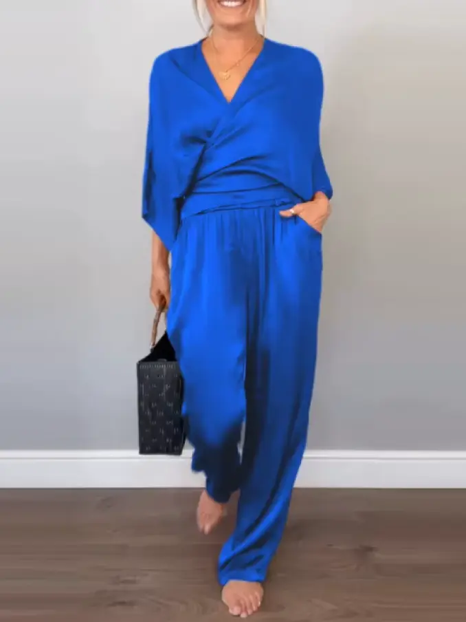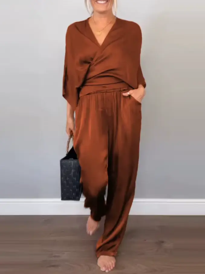 Latest Design Fashion Chic V-neck Tops Women Two Piece Set Solid Color Satin Wide Leg Pants for Ladies