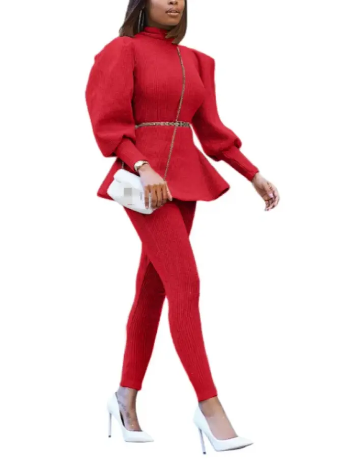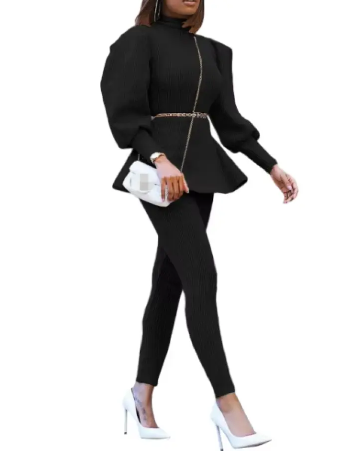 Ladies Two-piece Set Solid Color Female Half Collar Lantern Sleeve Suit
