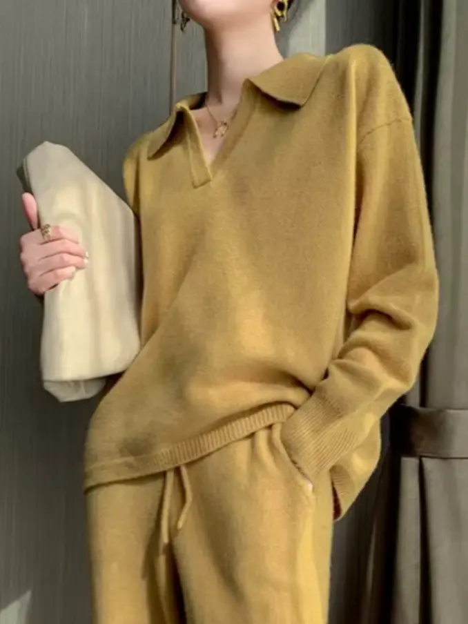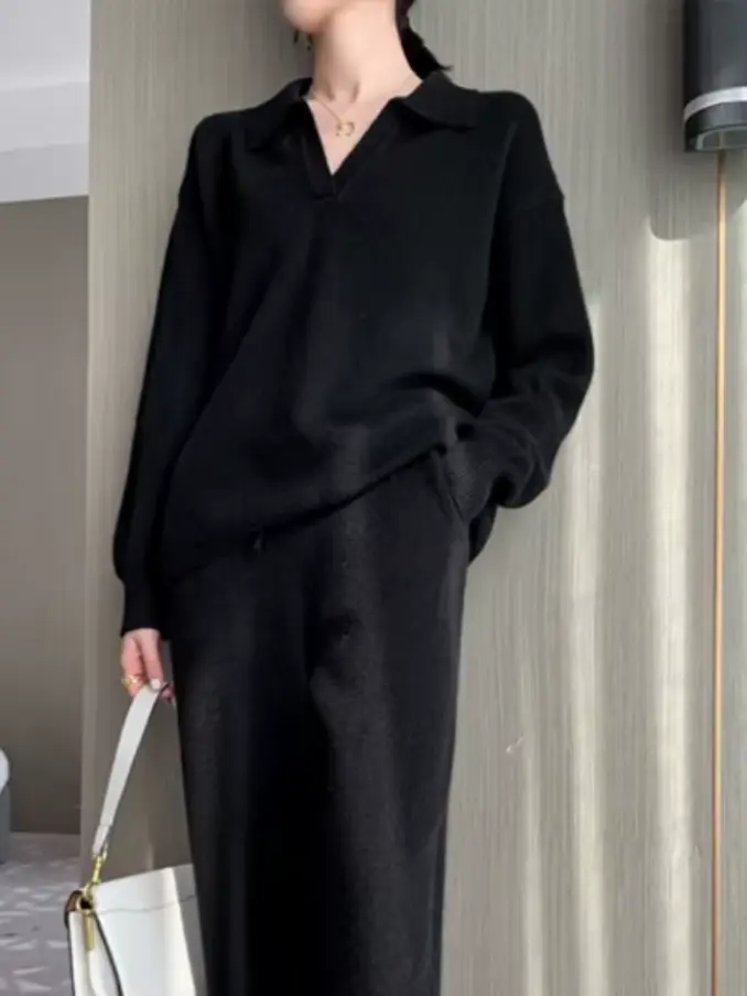 Ladies 2 Pieces Knitted Set V-neck Full Sleeve Pullovers & Straight Pants Loose Women Sweaters Long Sleeve Set