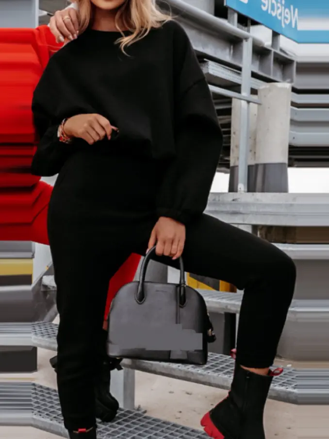 Solid Cotton Two Pieces Sets Casual Fleece Tracksuits Long-sleeve Pullover Loose Sweatshirt and Straight Pants Women's Sets