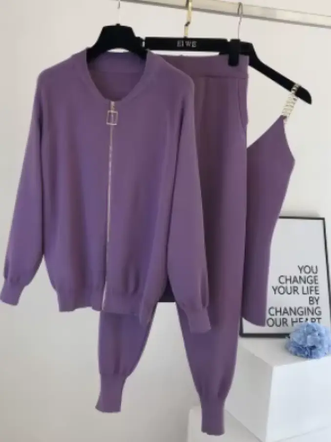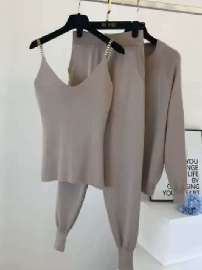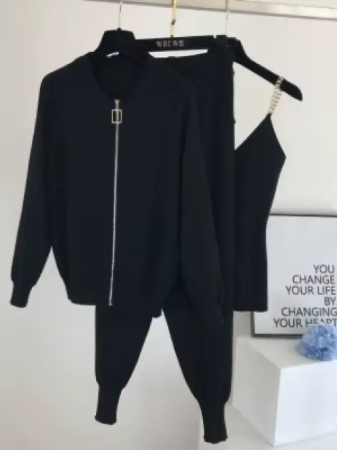 3pcs Knitting Suit Long-sleeved Zip Jacket Cardigans Tank Top Pants Women Fashion Solid Lounge Set Casual Tracksuit