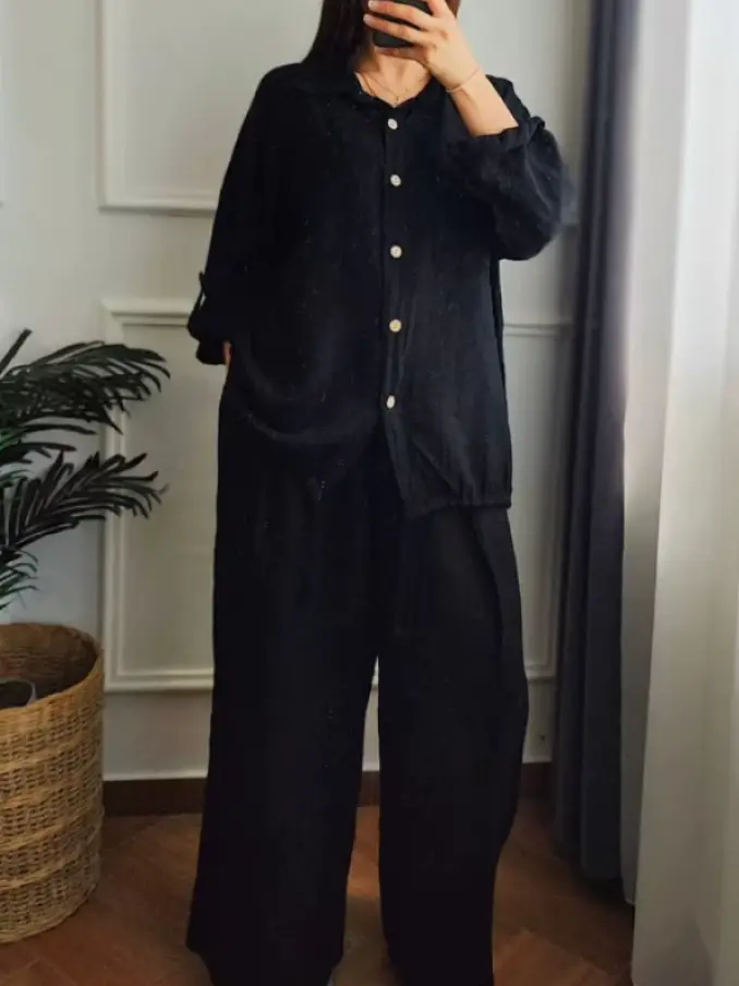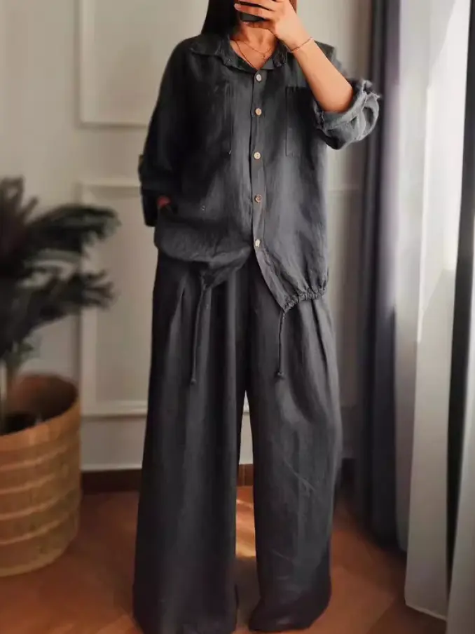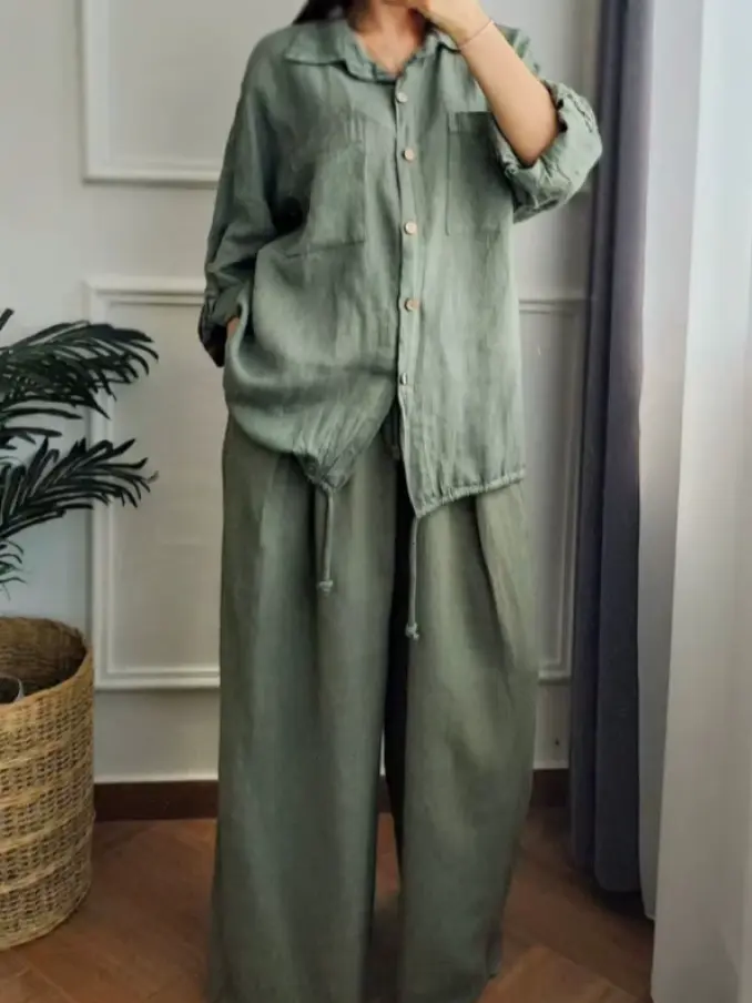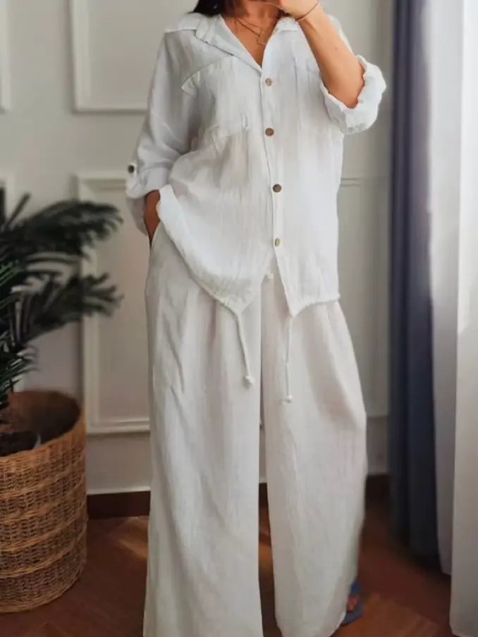 Women Clothes Button Long Sleeve Shirt + Long Pant 2 Piece Set All Matching Casual Suits