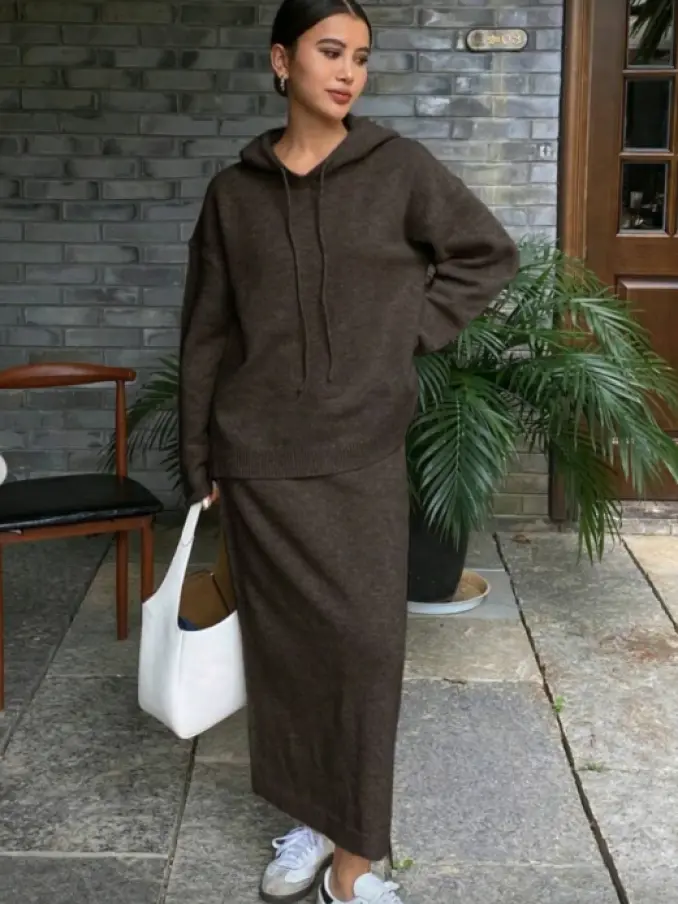 Women Hooded Knitted Pullovers & Midi Skirts Set