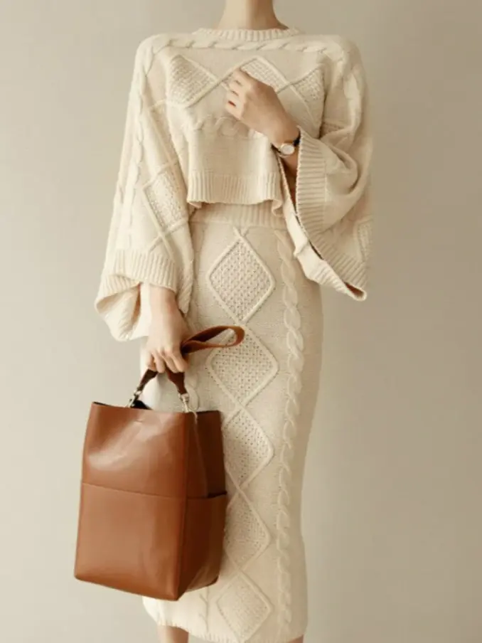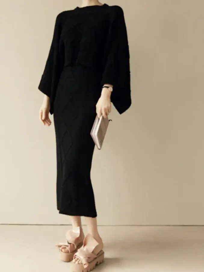 Style Twist Bat Sleeve Sweater High Waist Split Half Skirt Knitted Two Piece Suit Skirt Women