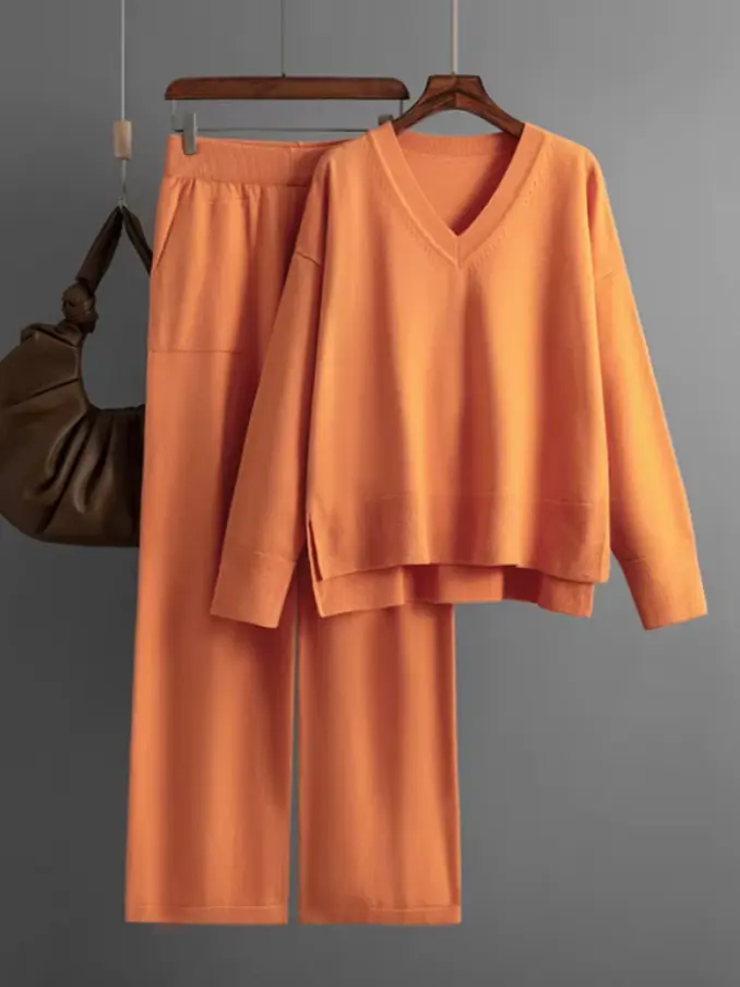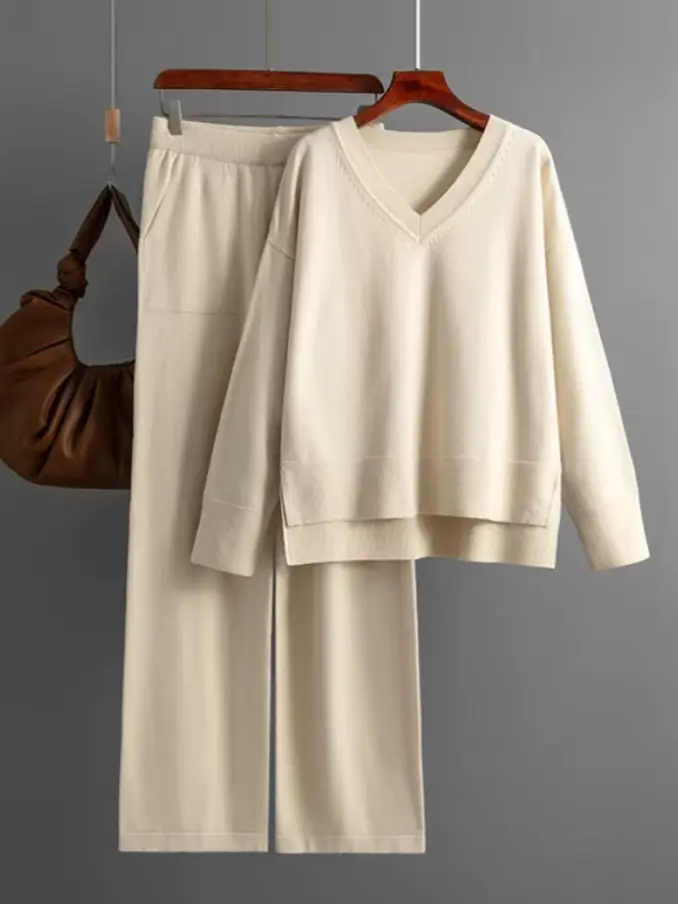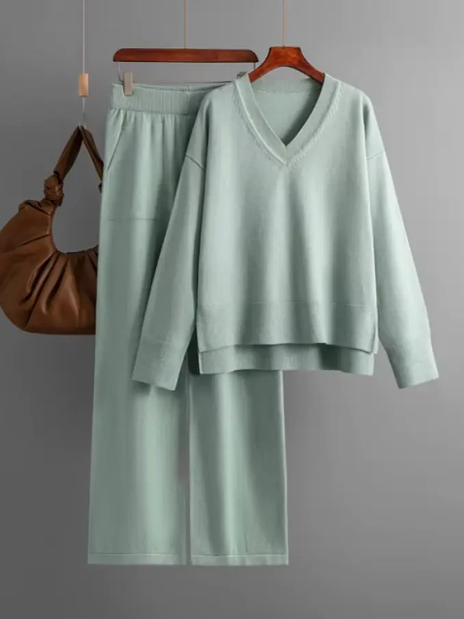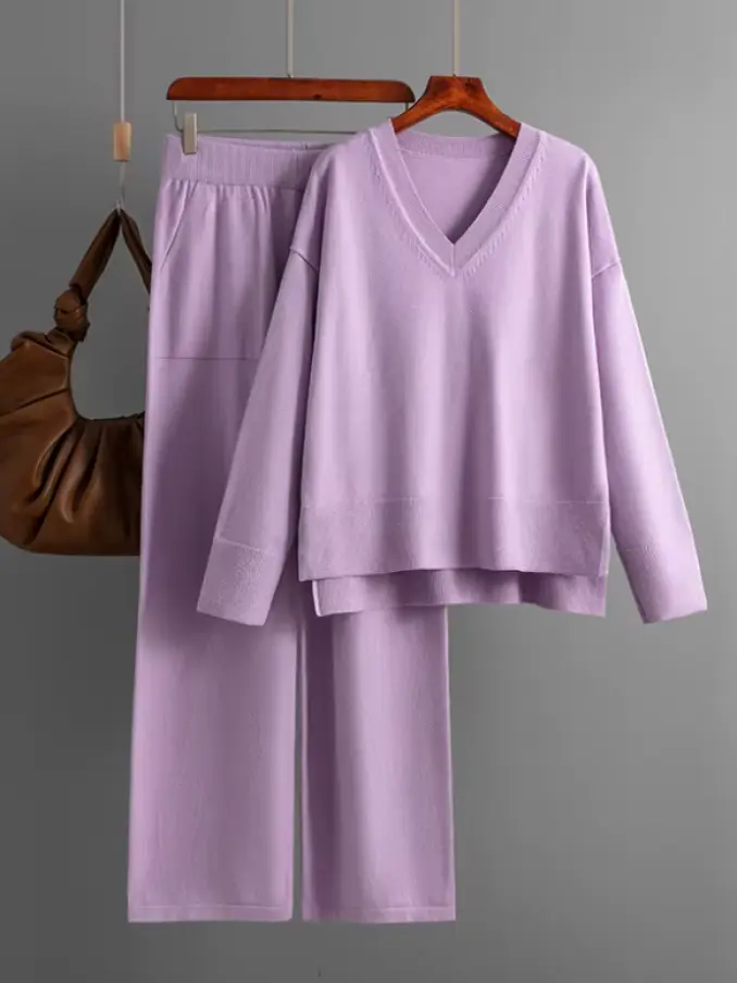 Women's Loose Style Breathable Solid V-Neck Tops and Wide Leg Pants Casual Sweater Pullover Set